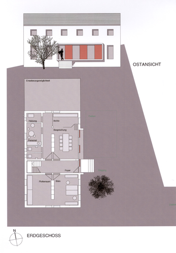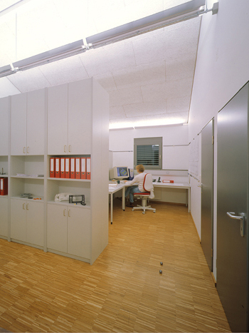 Zehn CAD-Arbeitsplätze auf einer Ebene im Obergeschoss waren die Vorgaben der Bauherrschaft. Jeder Arbeitsplatz hatte ein Modul von 2,50 m x 2,50 m. Die sich hieraus ergebende Arbeitsplatzanordnung sowie die natürliche Belichtung und Belüftung gliedern die Fassaden. Im Erdgeschoss wurden die Haustechnik und repräsentative Räume für Kundengespräche angeordnet. Das Gebäude wurde mit einer monolithischen Ziegelaussenwand und Stahlbetondecken auf einer elastisch gebetteten Bodenplatte erbaut. Das Projekt wurde durch das Land Hessen im Rahmen der Dorferneuerung gefördert.