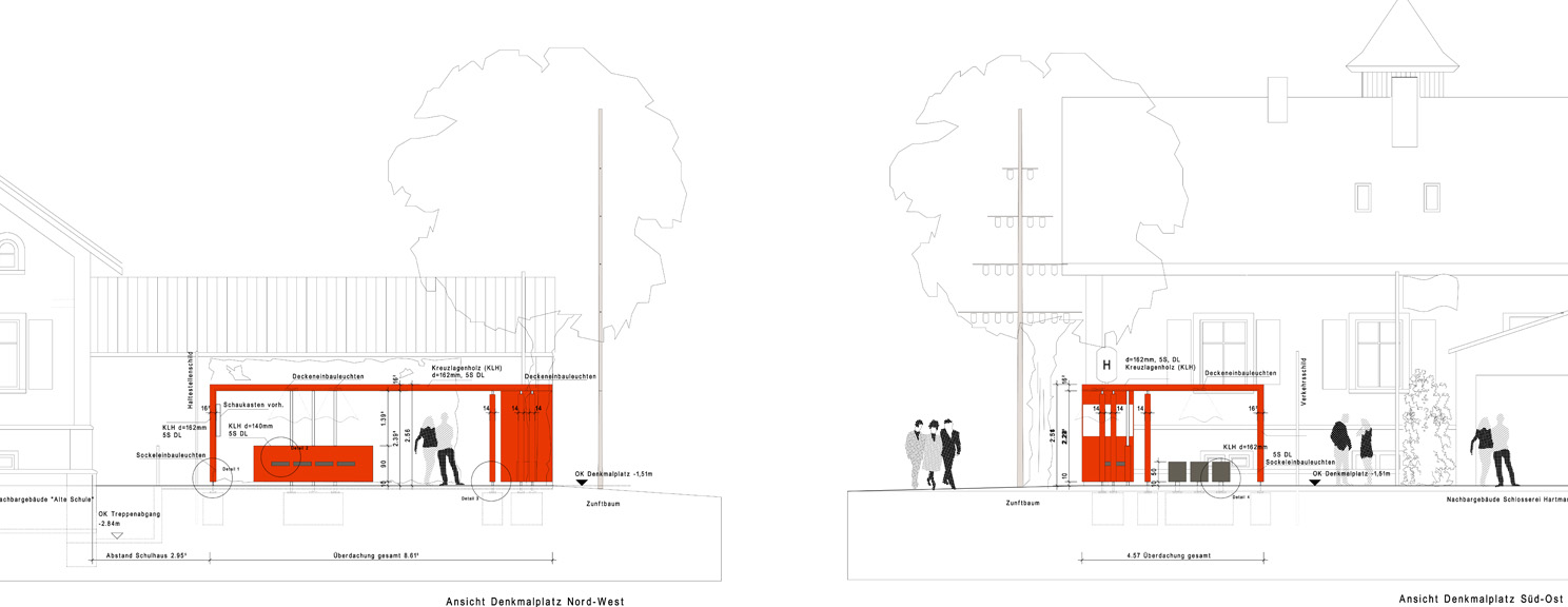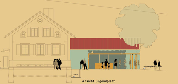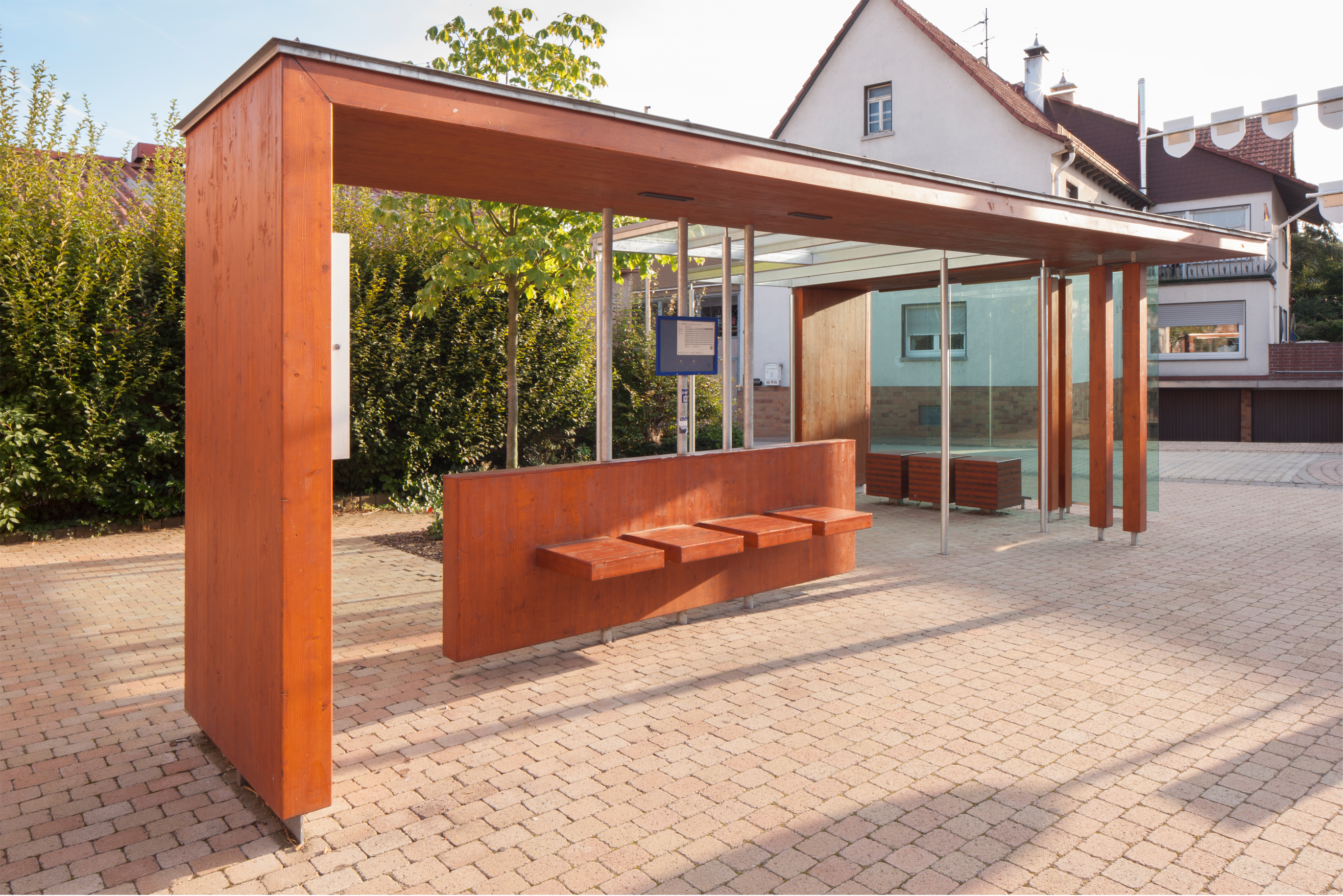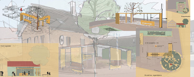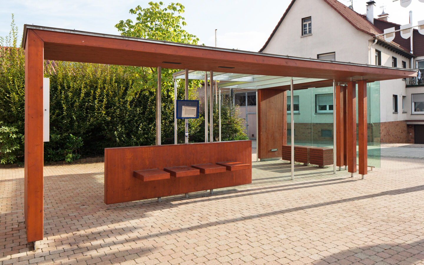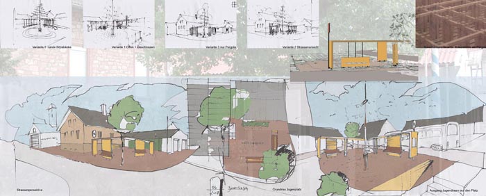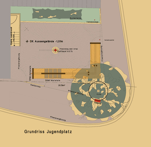 Die Aufgabe bestand darin, den Platz umzugestalten und neu zu ordnen, da ihm zusätzlich die Funktion einer Bushaltestelle zugeteilt wurde. Die bestehende Eiche blieb als markantes Element erhalten. Die Überdachungsanlage mit Sitzbereichen, die als L-Form ausgebildet wurde, erschließt zum einen den Platz baulich und bietet zum anderen die Möglichkeit des Verweilens an.