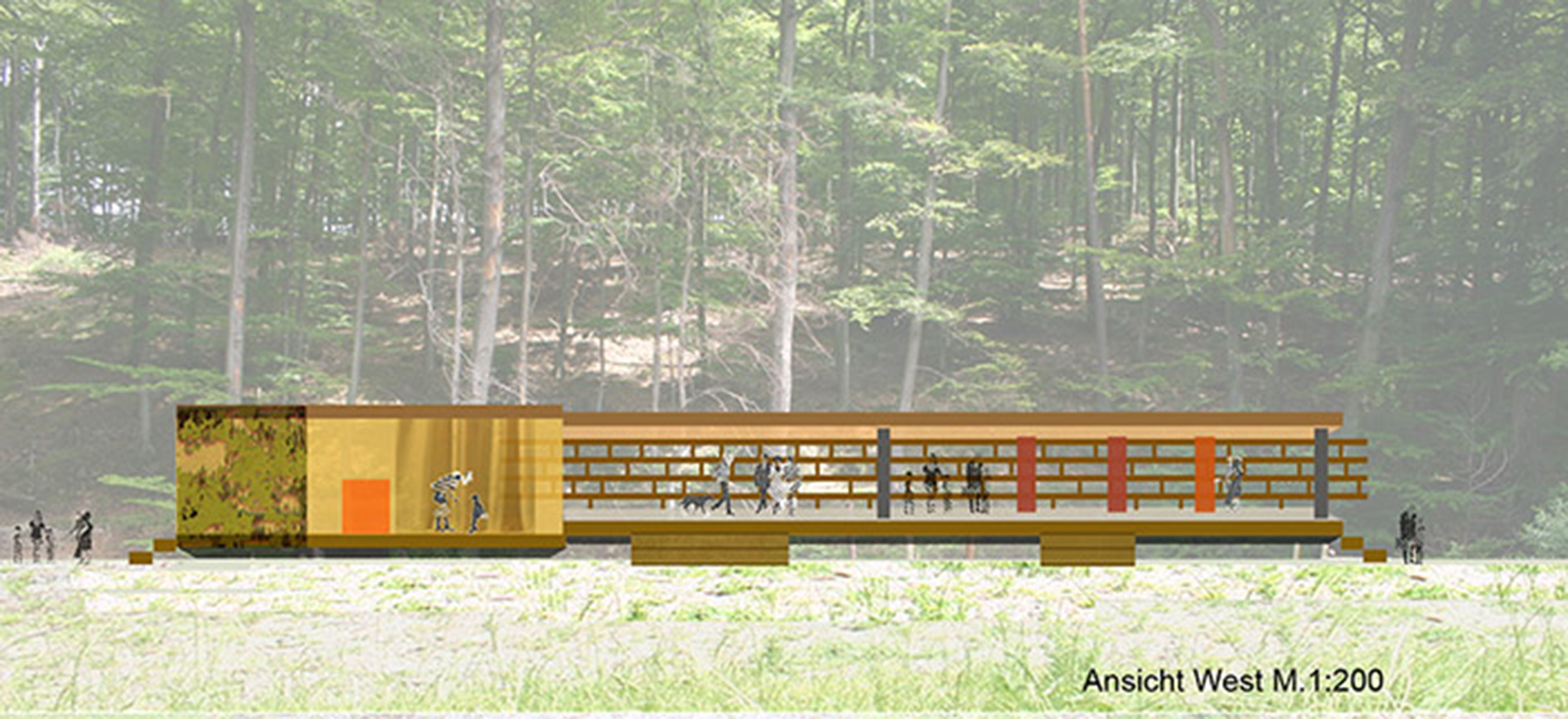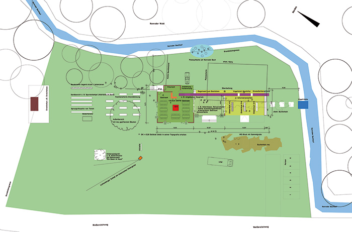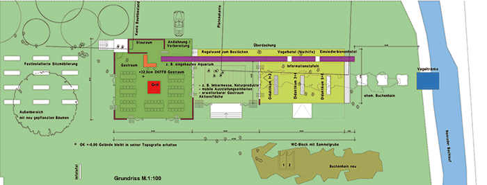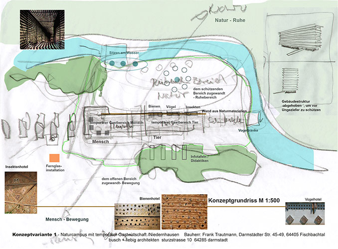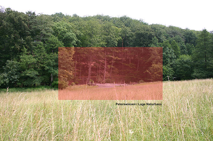 Auf dem Gelände der Peterswiesen, direkt am Waldrand, sollte ein sogenanntes „Naturhaus“ entstehen. Dieses bietet zum einen die Möglichkeit, Passanten oder Besuchern durch pädagogische Maßnahmen Wissen über Natur und Standort mit kulturellem Hintergrund zu vermitteln. Zum anderen stellt der Bauherr einen erweiterbaren Gastraum für temporäre Bewirtungen wie zum Beispiel Grillfeste bereit. nnBaulich wurde eine natürlich und ökologisch sinnvolle Lösung angestrebt, um das „naturnahe Konzept“ umzusetzen. Das Gelände wurde in einen ungenutzten Bereich, der zur Ruhe einlädt, und einen Aktionsbereich, den pädagogischen Campus, geteilt. Die Trennung erfolgt durch das Naturhaus beziehungsweise dessen Regalwand.