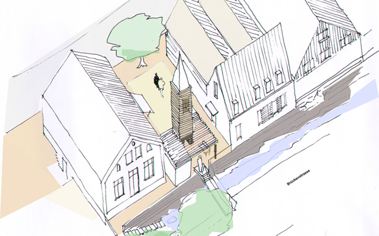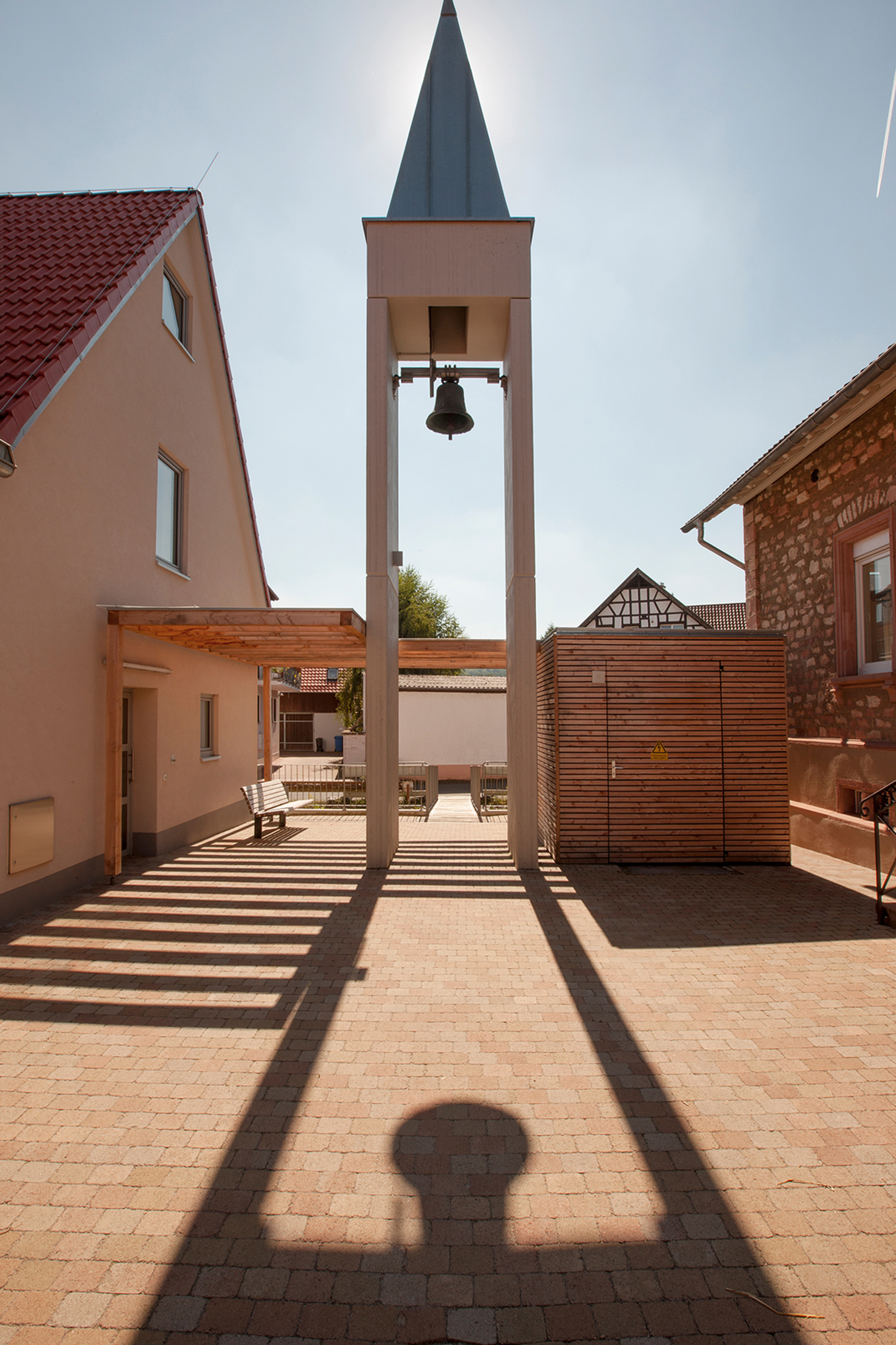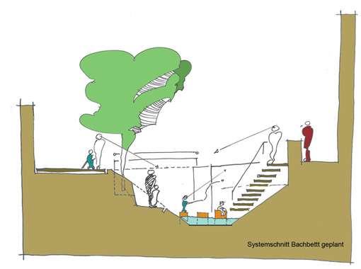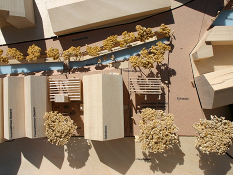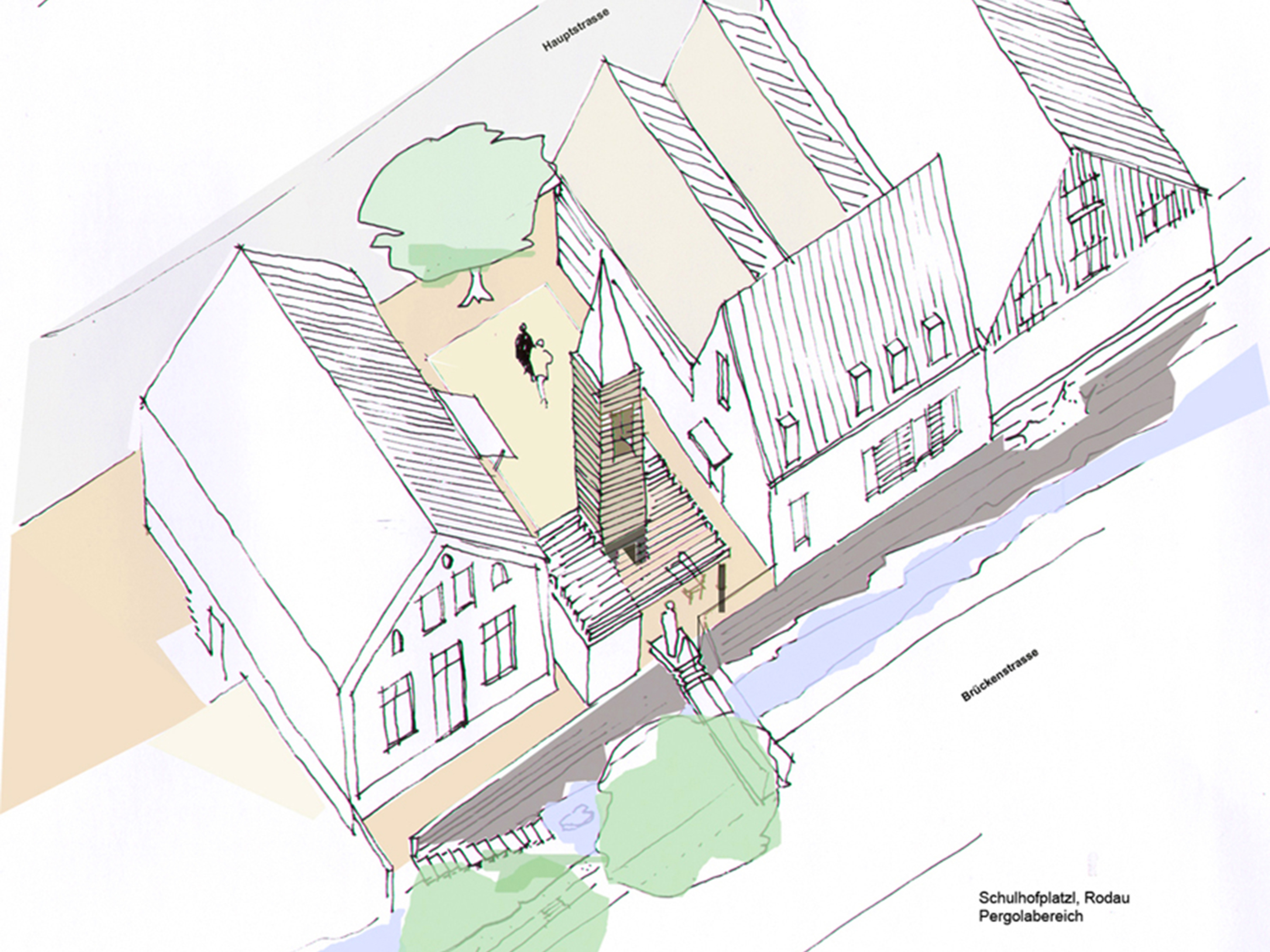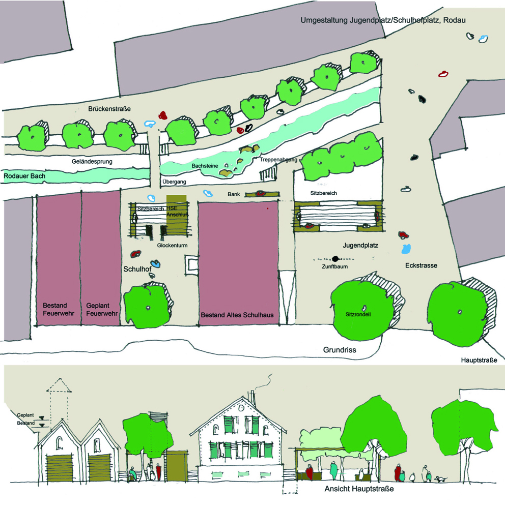 Inhalt der Aufgabe war die Umgestaltung des „Rodauer Bachlaufs“ und der angrenzenden Plätze. Dem Schulhofplatz und dem Jugendplatz wurden rückwärtig jeweils ein überdachter Sitzbereich mit Orientierung zum Bachlauf zugeordnet. Eine Baumreihe im vorderen Platzbereich filtert den fließenden Verkehr der Hauptstraße. Der geplante Übergang verbindet den Schulhofplatz mit der Brückenstraße. Die Anbindung an den Dorfplatz wird somit auch im rückwärtigen Bereich geschaffen. Durch einen Geländesprung am Bachlauf und eine entsprechende lineare Baumbegrünung wird der Bachlaufbereich erlebbar und lädt zum Verweilen ein. Um die drei Plätze und deren Zuwegung optisch zu unterstreichen und miteinander zu verbinden, ist ein einheitlicher Platzbelag vorgesehen.
