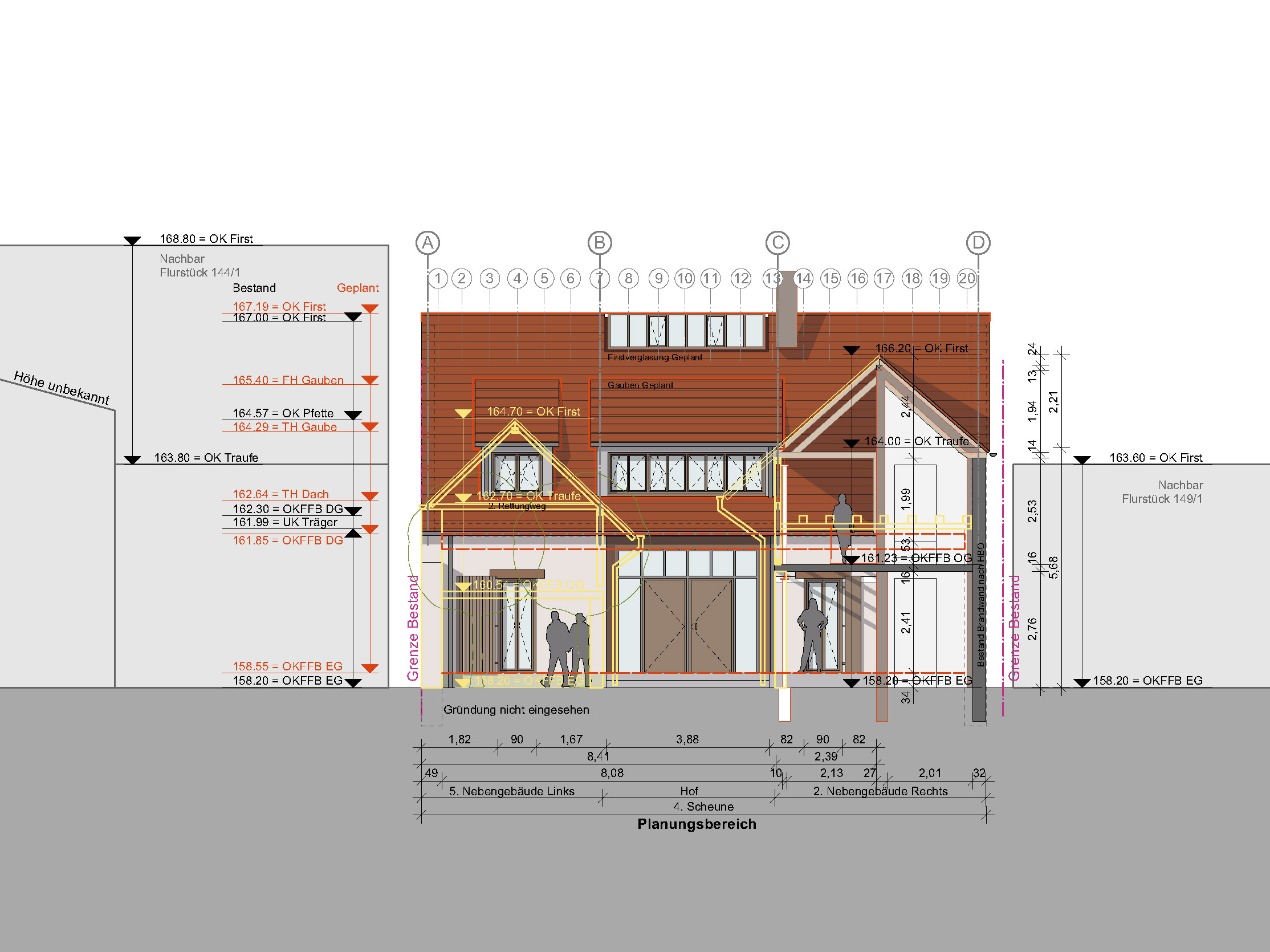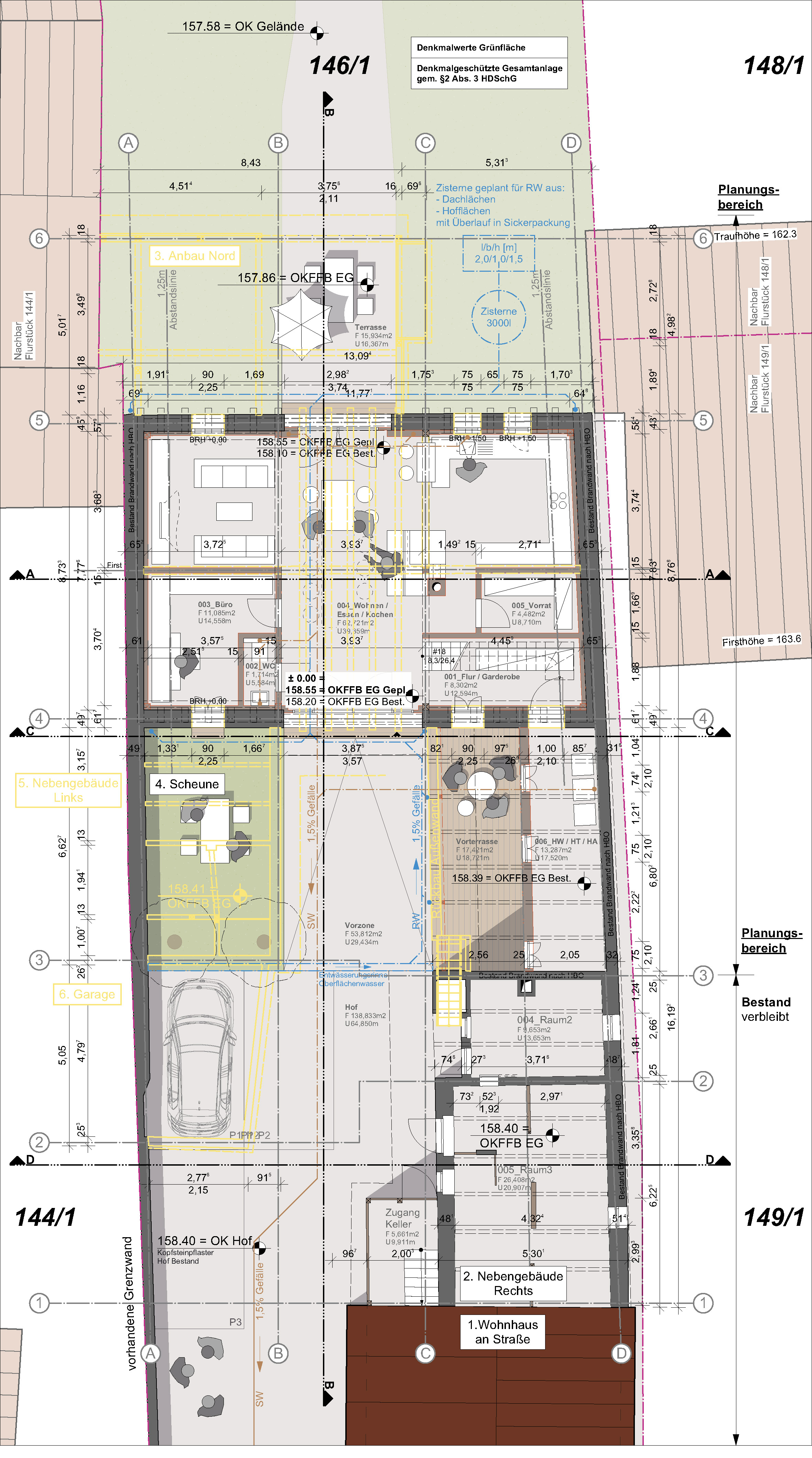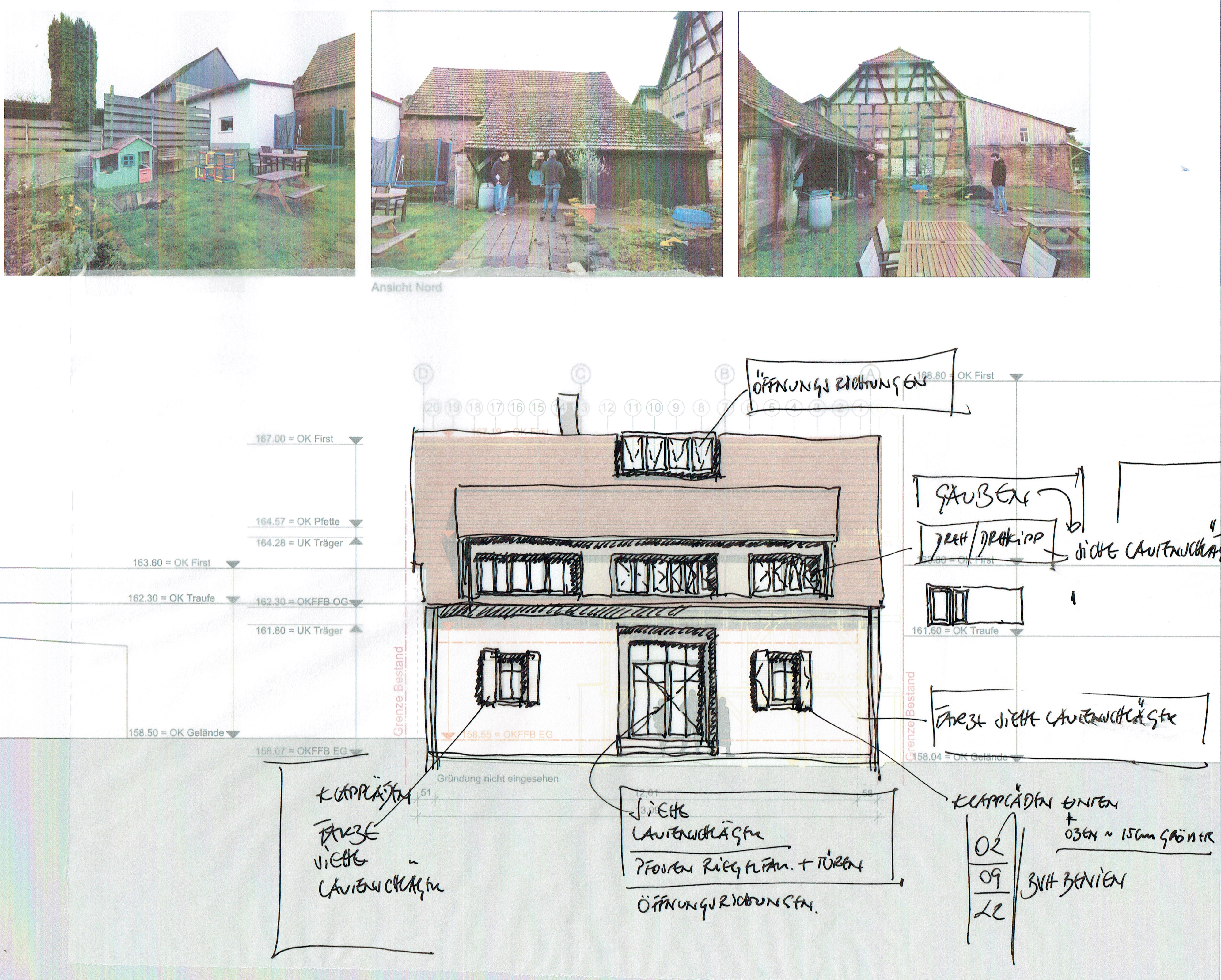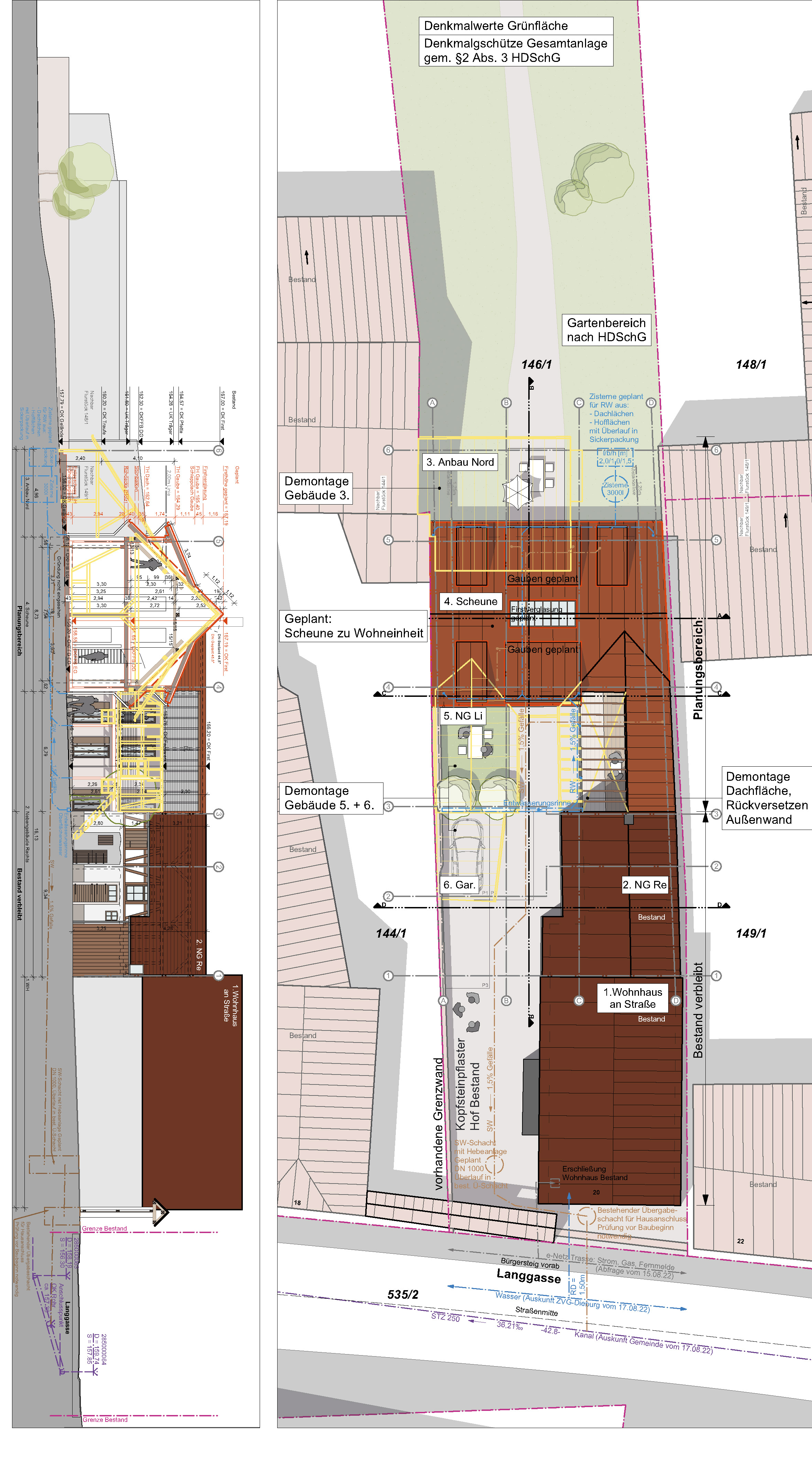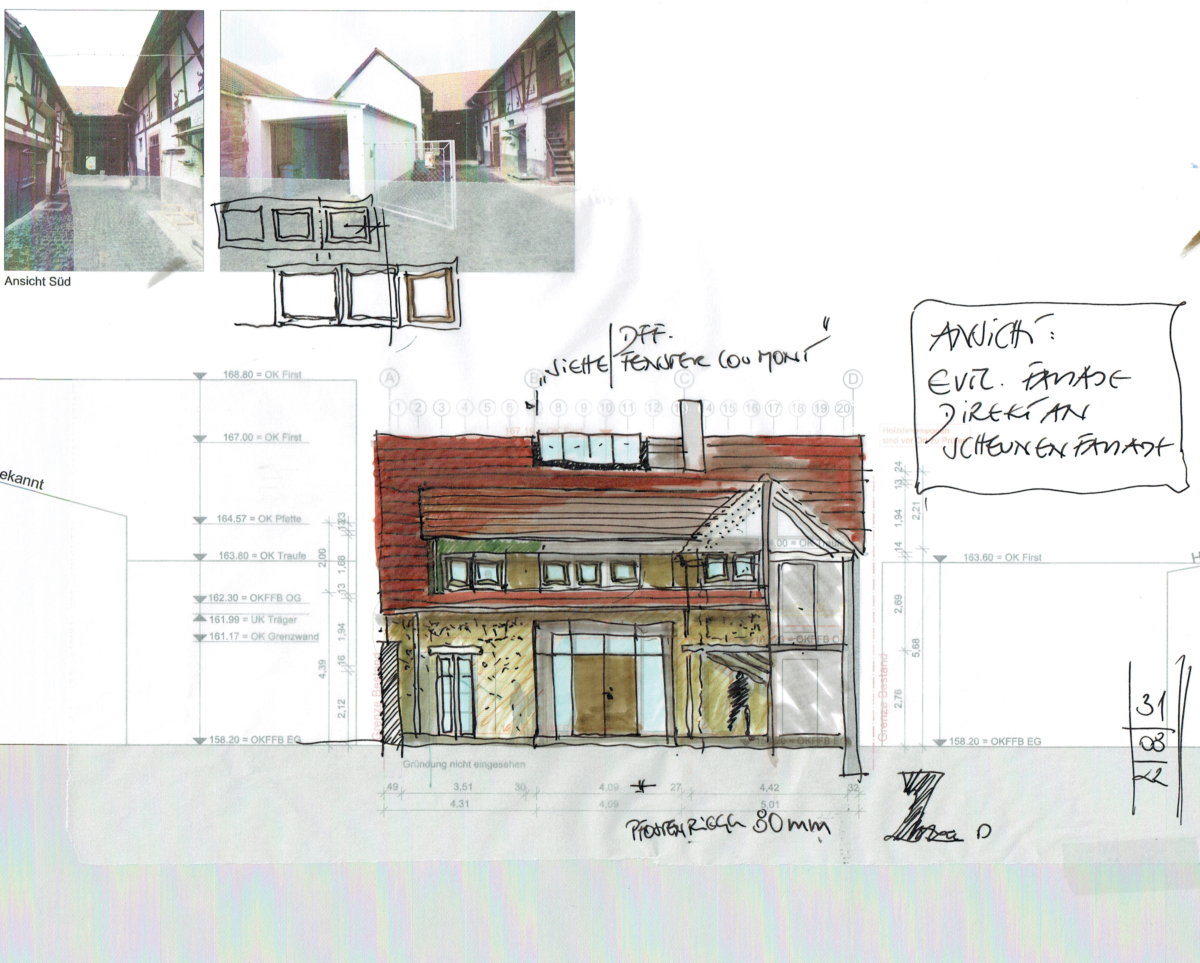 Die Scheune steht quer zum Hof und nahezu beidseitig auf der Grundstücksgrenze. Sie wird über den Hof erschlossen und schließt direkt an die Nebengebäude Rechts und Links und den Anbau Nord an. Aufgrund der geringen Grundstücksbreite ist geplant, das Nebengebäude Links mit Garage und den Anbau Nord komplett zurückzubauen, um eine Belichtung beider Wohngeschosse (Erd- / Obergeschoss) der Scheune zu ermöglichen. Das Nebengebäude Rechts (Achse 3-4) soll in Teilen zurückgebaut werden. Hier ist geplant, die südliche Dachfläche (unter Erhalt der Holzkonstruktion) zu entfernen und im Erd- / Obergeschoss die südliche Außenwand ca. um die Hälfte der Gebäudebreite zurückzusetzen. Hieraus entsteht eine überdachte Zone auf Hofebene mit darüberliegendem Balkon auf der Höhe des Obergeschosses. Gartenseitig ist in der Verlängerung der ehemaligen Scheunendurchfahrt eine Terrasse geplant.