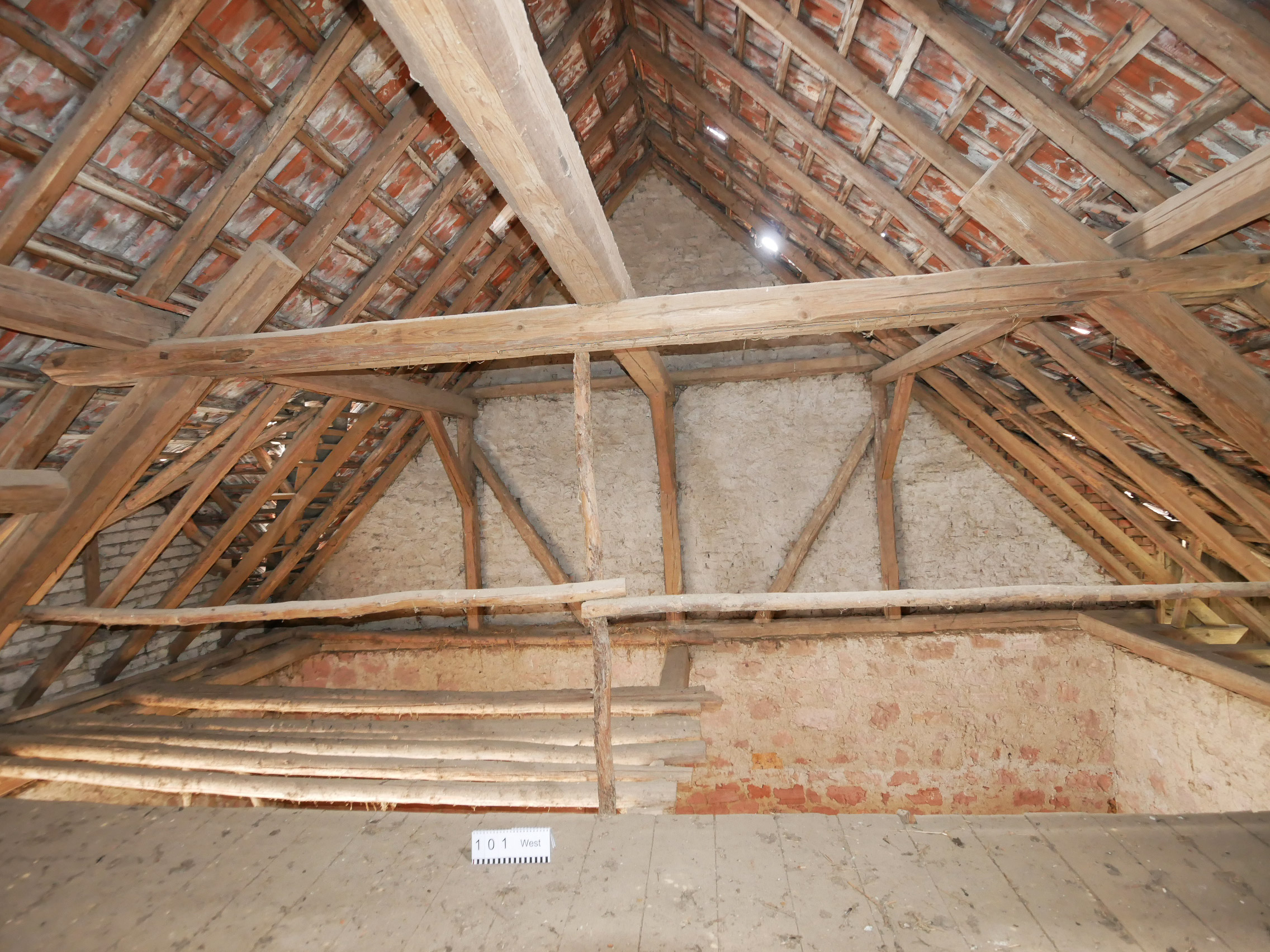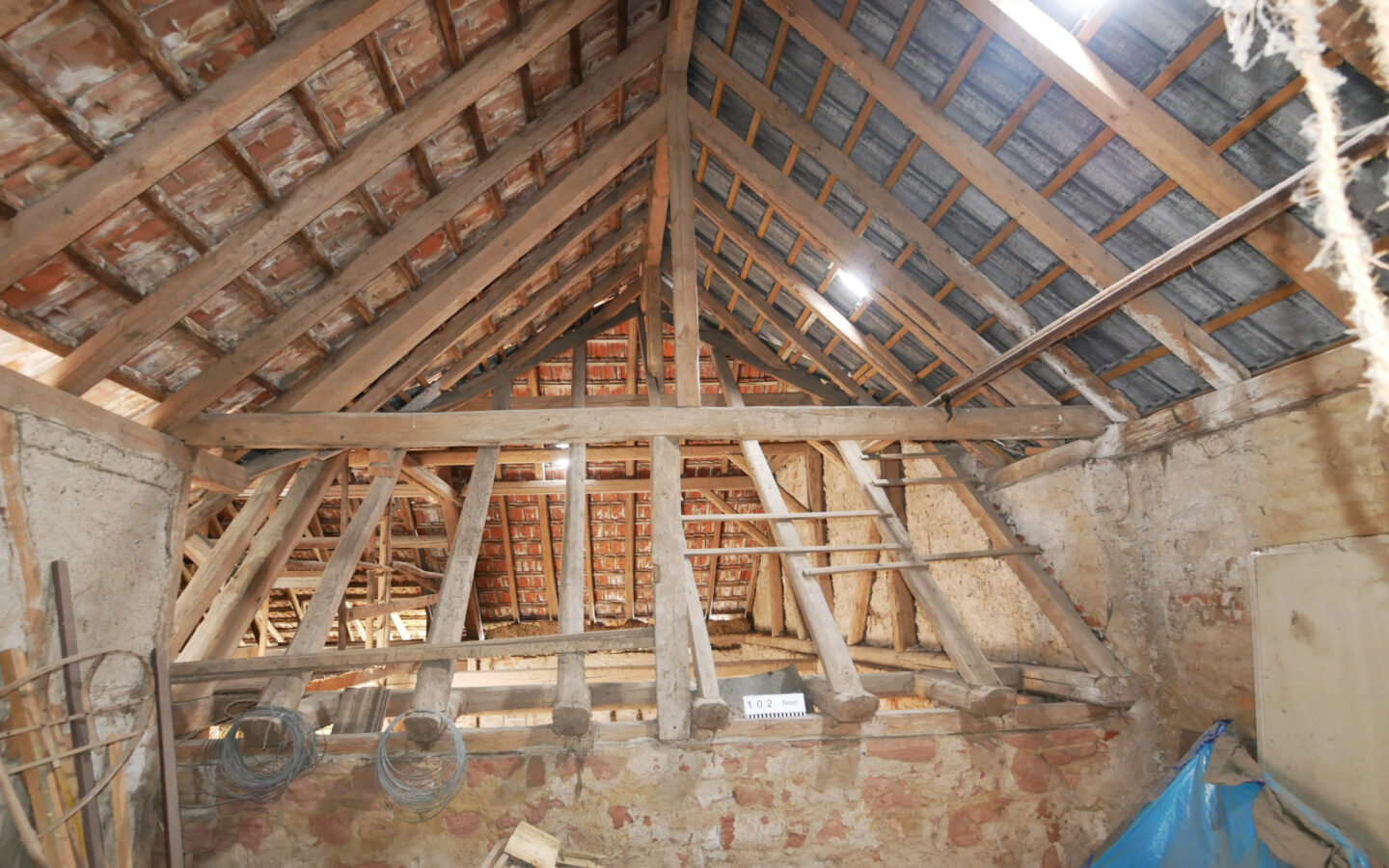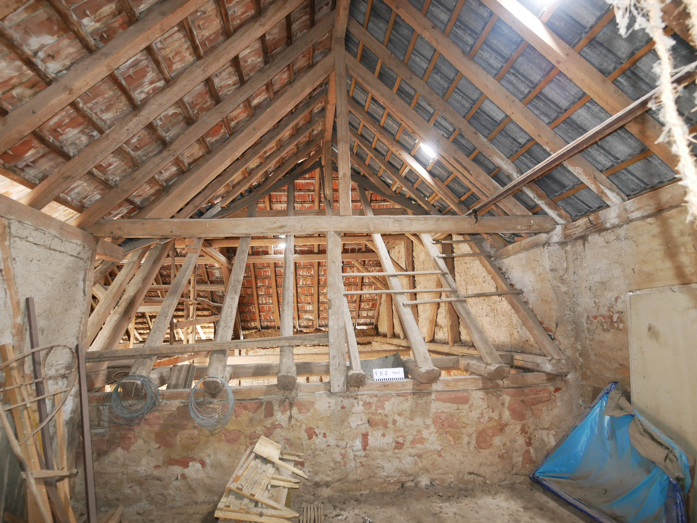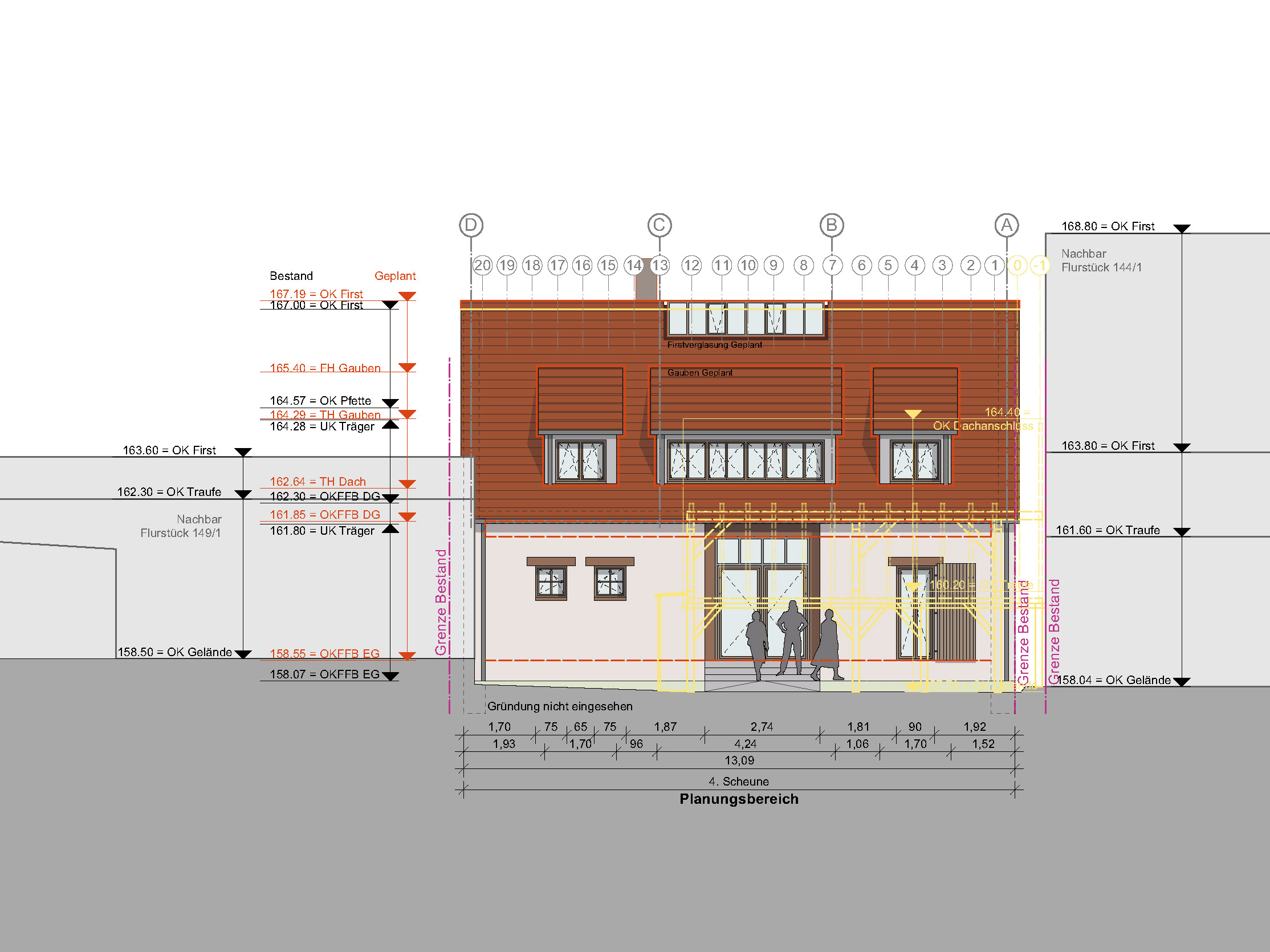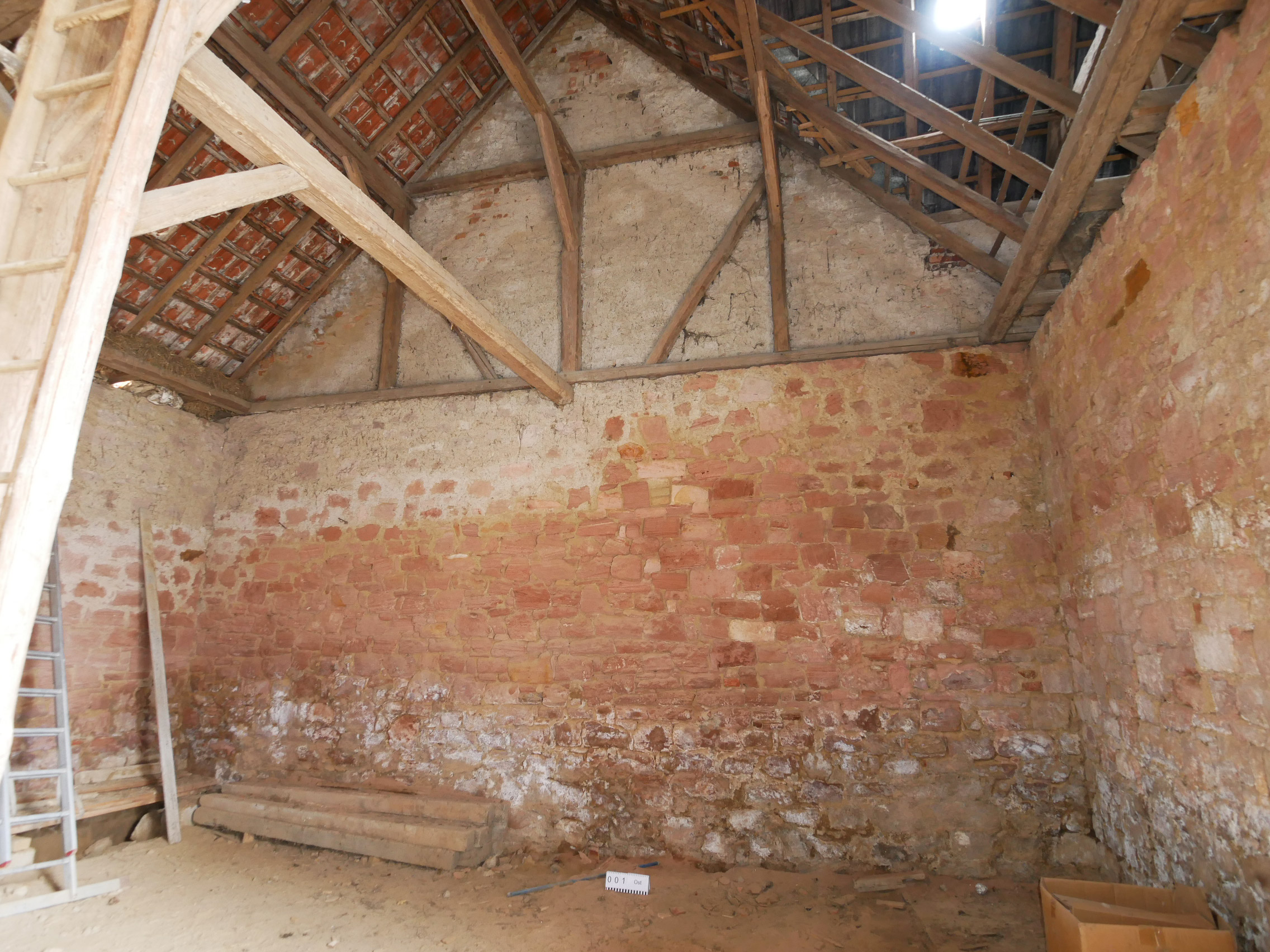 Die Scheune steht quer zum Hof und nahezu beidseitig auf der Grundstücksgrenze. Sie wird über den Hof erschlossen und schließt direkt an die Nebengebäude Rechts und Links und den Anbau Nord an. Aufgrund der geringen Grundstücksbreite ist geplant, das Nebengebäude Links mit Garage und den Anbau Nord komplett zurückzubauen, um eine Belichtung beider Wohngeschosse (Erd- / Obergeschoss) der Scheune zu ermöglichen. Das Nebengebäude Rechts (Achse 3-4) soll in Teilen zurückgebaut werden. Hier ist geplant, die südliche Dachfläche (unter Erhalt der Holzkonstruktion) zu entfernen und im Erd- / Obergeschoss die südliche Außenwand ca. um die Hälfte der Gebäudebreite zurückzusetzen. Hieraus entsteht eine überdachte Zone auf Hofebene mit darüberliegendem Balkon auf der Höhe des Obergeschosses. Gartenseitig ist in der Verlängerung der ehemaligen Scheunendurchfahrt eine Terrasse geplant.