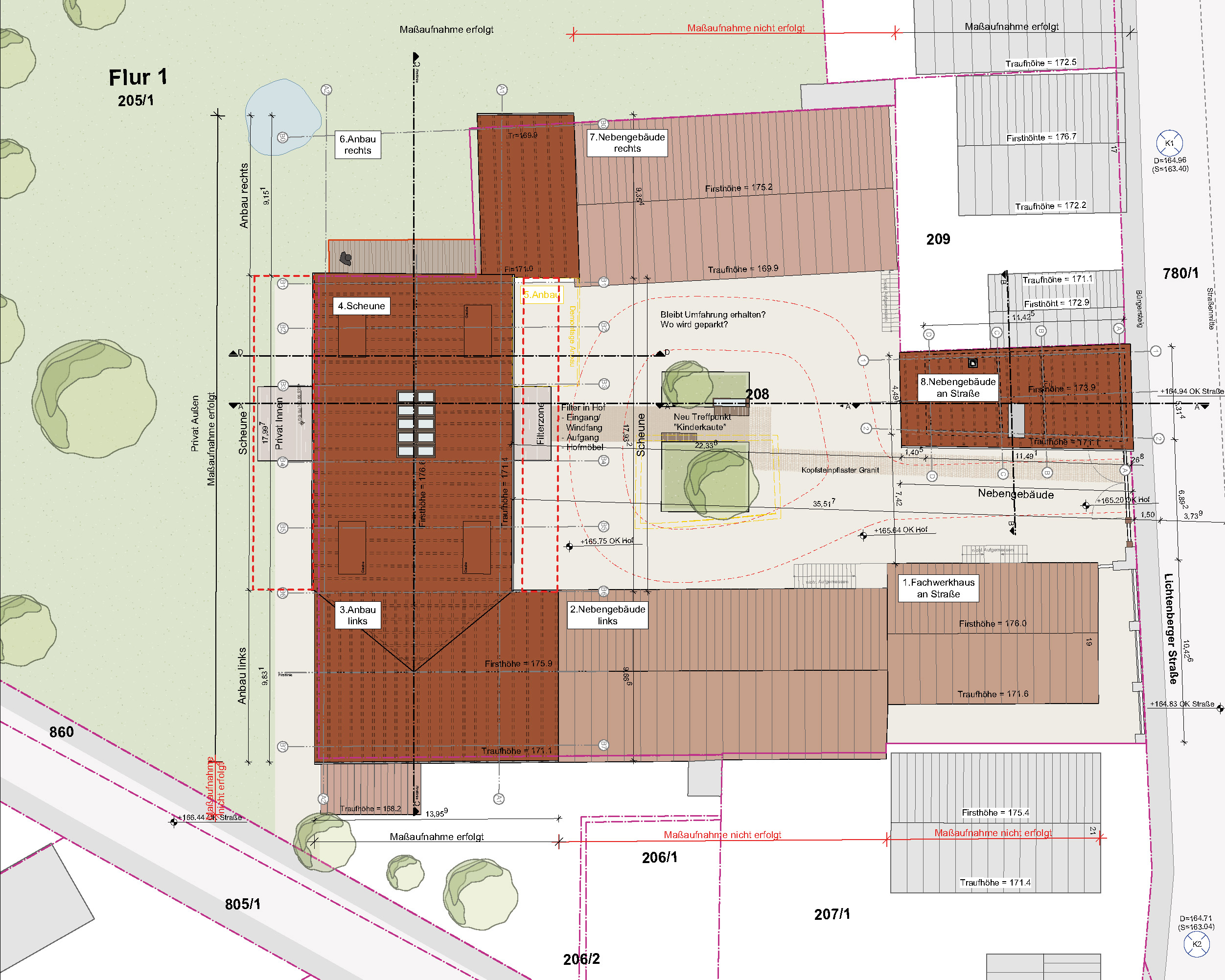 Die traufständige Scheune zum Hof, mit Satteldach, gliedert sich in 3 Bereiche durch den Scheunentorbereich, welcher in Zukunft als Wohnhalle genutzt werden soll. Im Dachstuhl ist eine fünfteilige Feldeinteilung ablesbar. Die Scheune ist im Norden durch einen Anbau ergänzt worden (6.Anbau) dieser wird demontiert. Das Gewölbe im Norden bleibt jedoch erhalten. An der Ostfassade gibt es ebenfall einen Anbau (5.Anbau) welcher auch demontiert wird um die ursprüngliche Scheunenkubatur wieder freizustellen. Die Nebengebäude im Süden der Hofreite bleiben erhalten.