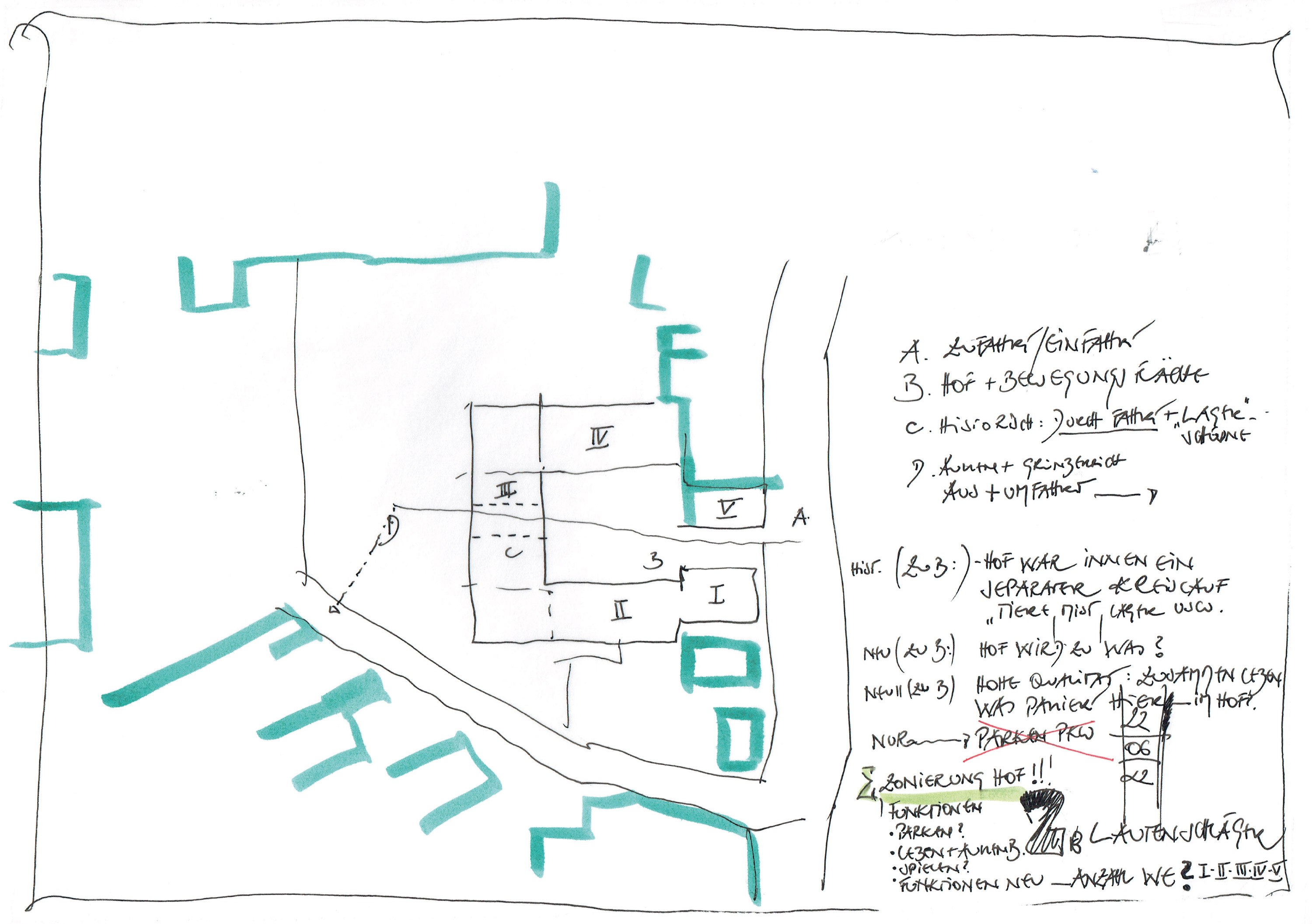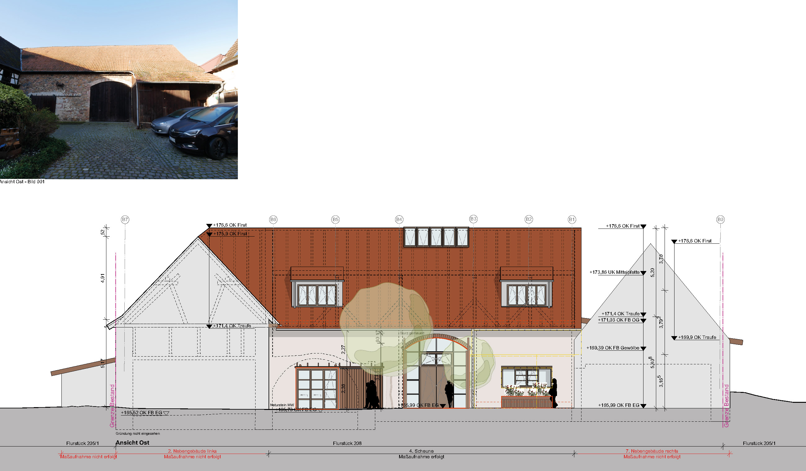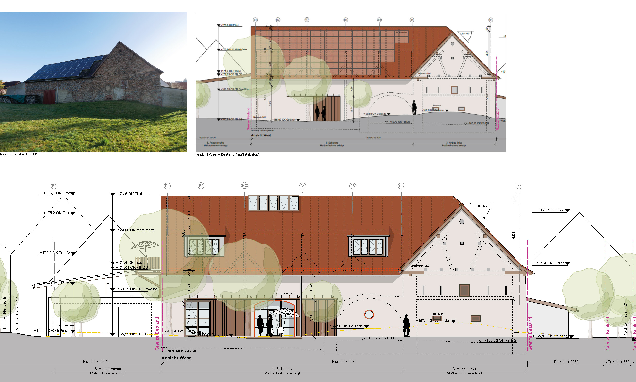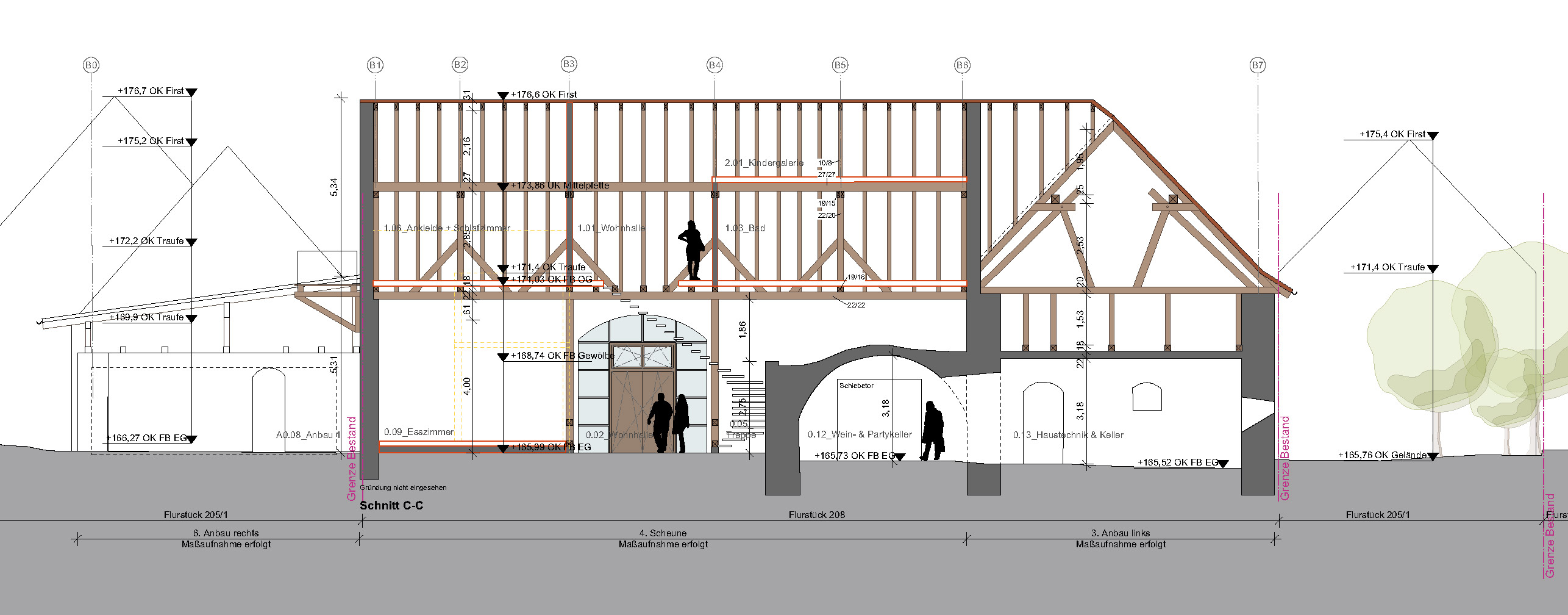 Die Scheune soll zu einem Wohnhaus mit einer Nutzungseinheit umgebaut werden. Sie teilt sich in folgende 3 Bereiche im Erdgeschoss, in die Scheunendurchfahrt, das Gewölbe auf der linken Seite und den rechten Bereich. Die Scheunendurchfahrt soll zukünftig als temporär geheizte Wohnhalle genutzt werden. Vor dem Gewölbe befinden sich verschiedene Nebenfunktionen wie eine Garderobe, ein WC und die Erschließung nach oben. Das Gewölbe selbst wird als Wein-/Partykeller genutzt. Von hieraus erreicht man ein weiteres Gewölbe, welches ein Kellerersatzraum ist. Die rechte Scheunenseite wird als Wohnraum genutzt. Hier befinden sich die Küche, das Esszimmer und Wohnzimmer. Von der Wohnhalle erreicht man den Innenhof der Hofreite und auch die Terrasse mit Garten im Westen der Anlage. Im Obergeschoss wird die Dreiteilung der Nutzungen fortgeführt. In der Mitte befindet sich wieder die offene Wohnhalle von der aus man alle weiteren Räume erschließt. Der Bereich für die Kinder mit Bad und zwei Schlafzimmern befindet sich über dem Gewölbe auf der linken Seite. Auf der rechten Seite befindet sich der Bereich der Eltern, mit Badezimmer, Ankleide, Schlafzimmer und kleinem Balkon.