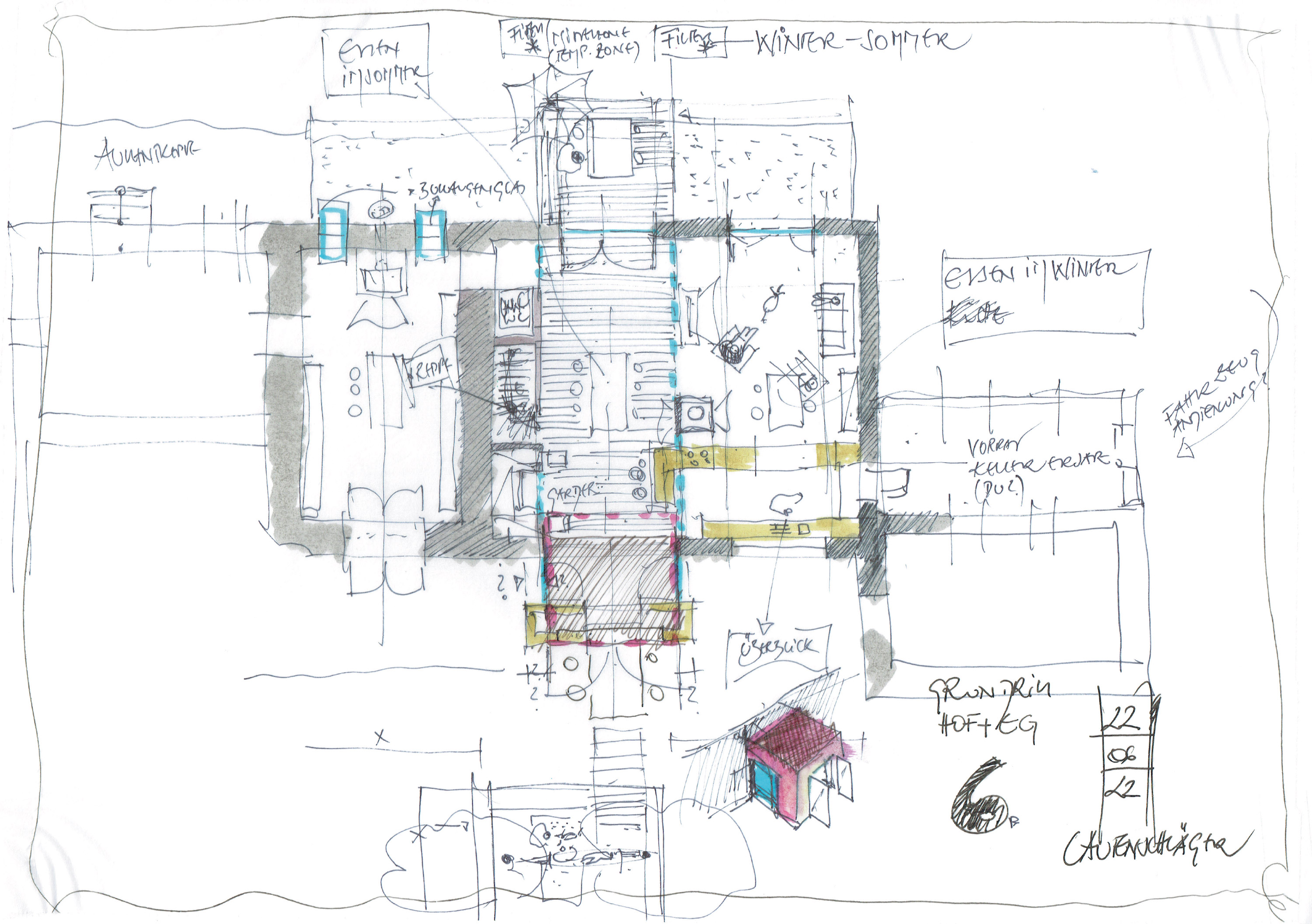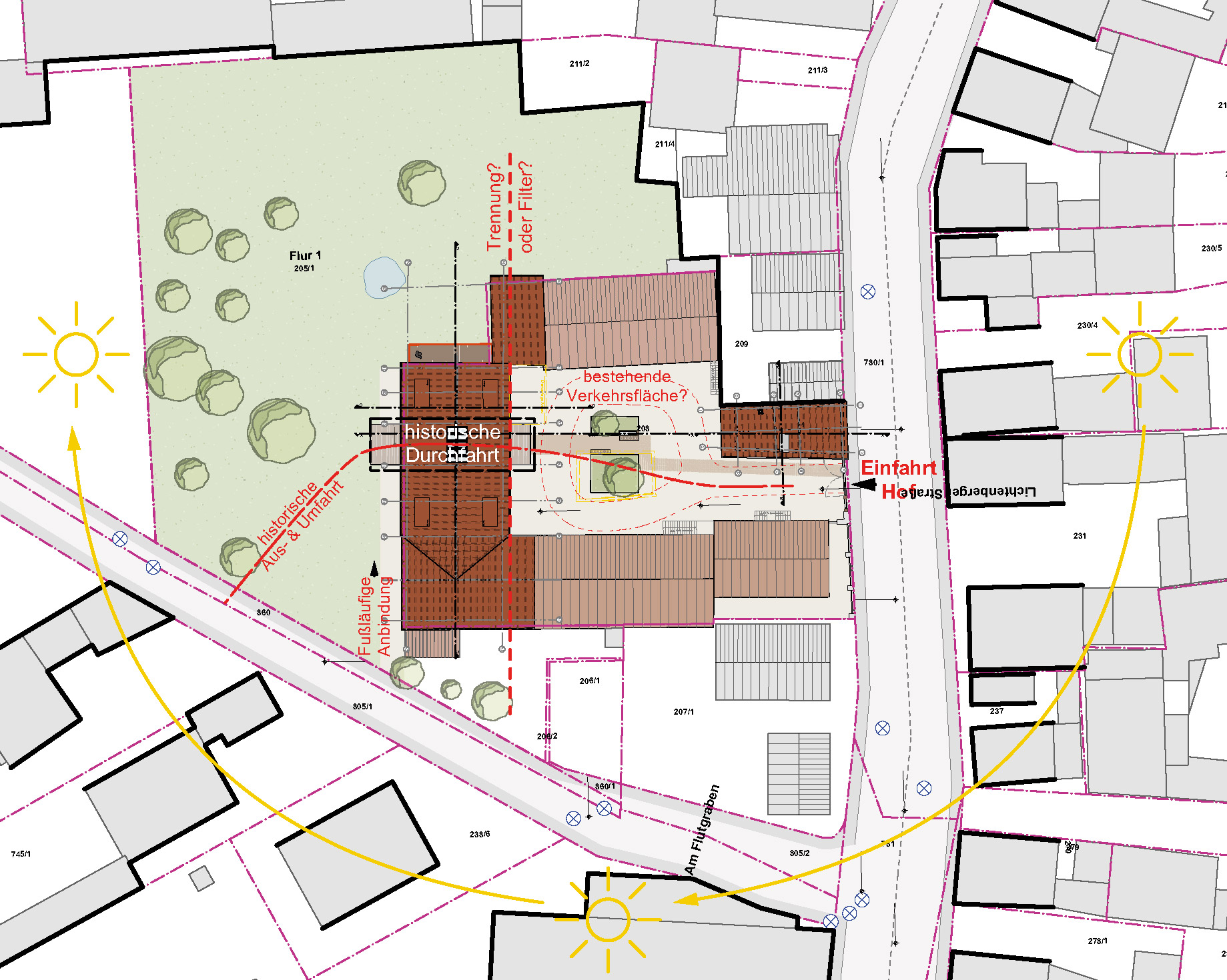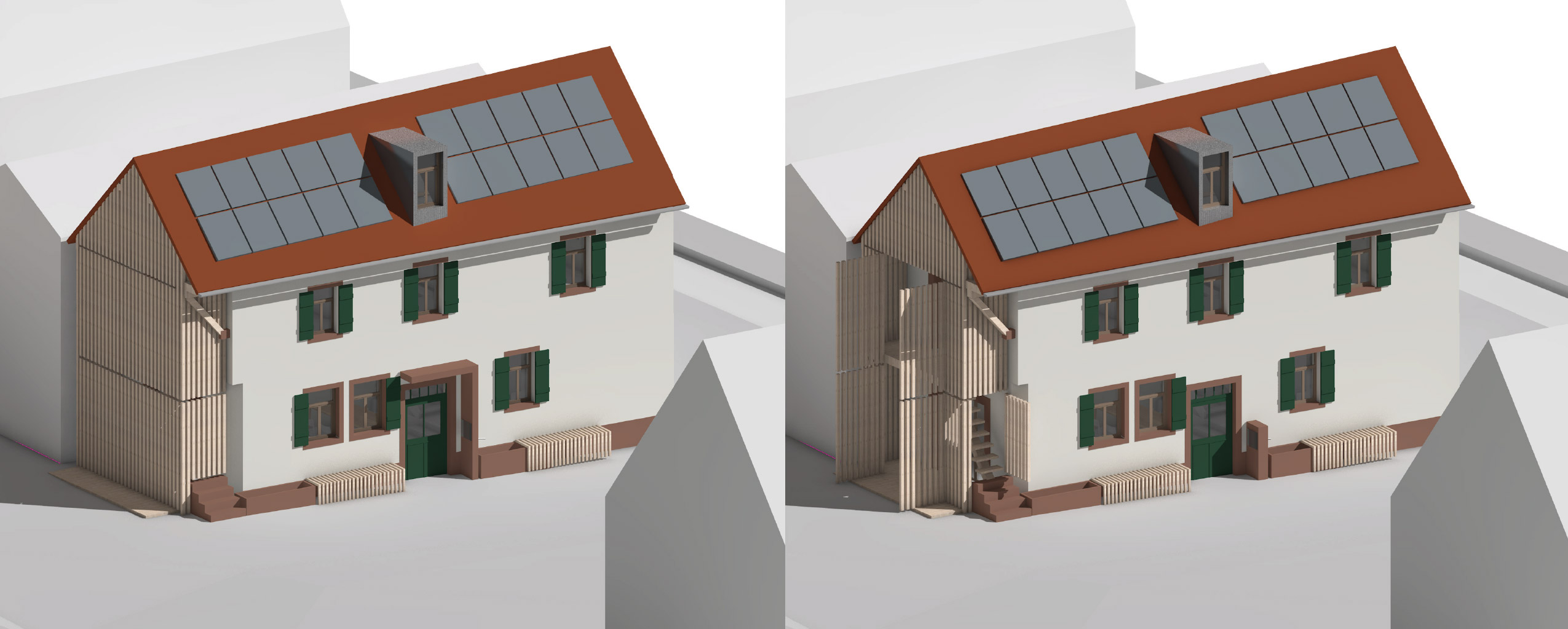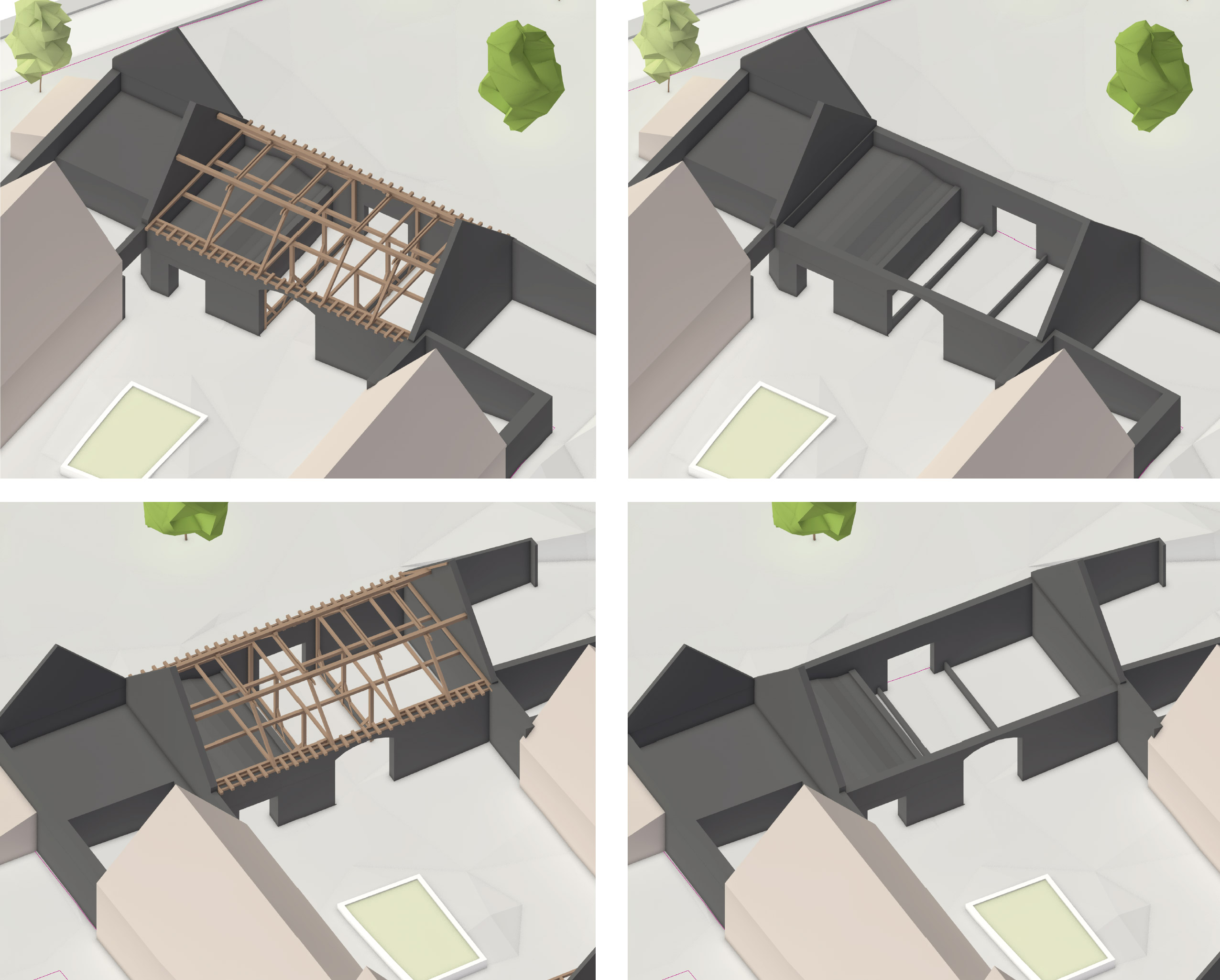Die Scheune soll zu einem Wohnhaus mit einer Nutzungseinheit umgebaut werden. Sie teilt sich in folgende 3 Bereiche im Erdgeschoss, in die Scheunendurchfahrt, das Gewölbe auf der linken Seite und den rechten Bereich. Die Scheunendurchfahrt soll zukünftig als temporär geheizte Wohnhalle genutzt werden. Vor dem Gewölbe befinden sich verschiedene Nebenfunktionen wie eine Garderobe, ein WC und die Erschließung nach oben. Das Gewölbe selbst wird als Wein-/Partykeller genutzt. Von hieraus erreicht man ein weiteres Gewölbe, welches ein Kellerersatzraum ist. Die rechte Scheunenseite wird als Wohnraum genutzt. Hier befinden sich die Küche, das Esszimmer und Wohnzimmer. Von der Wohnhalle erreicht man den Innenhof der Hofreite und auch die Terrasse mit Garten im Westen der Anlage. Im Obergeschoss wird die Dreiteilung der Nutzungen fortgeführt. In der Mitte befindet sich wieder die offene Wohnhalle von der aus man alle weiteren Räume erschließt. Der Bereich für die Kinder mit Bad und zwei Schlafzimmern befindet sich über dem Gewölbe auf der linken Seite. Auf der rechten Seite befindet sich der Bereich der Eltern, mit Badezimmer, Ankleide, Schlafzimmer und kleinem Balkon.