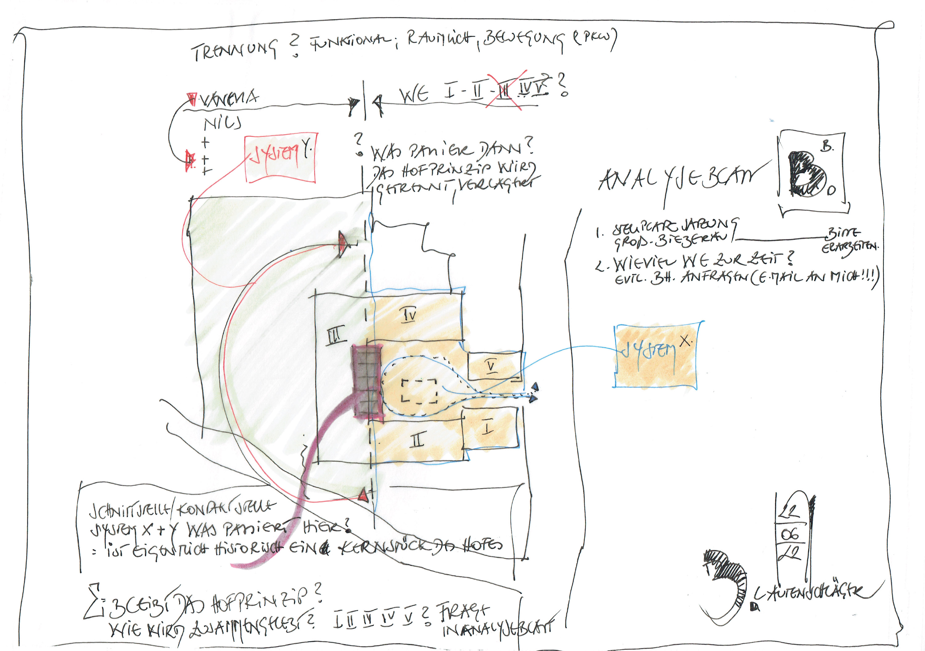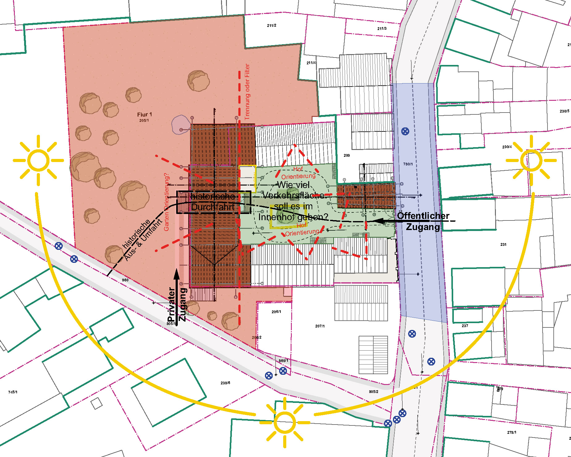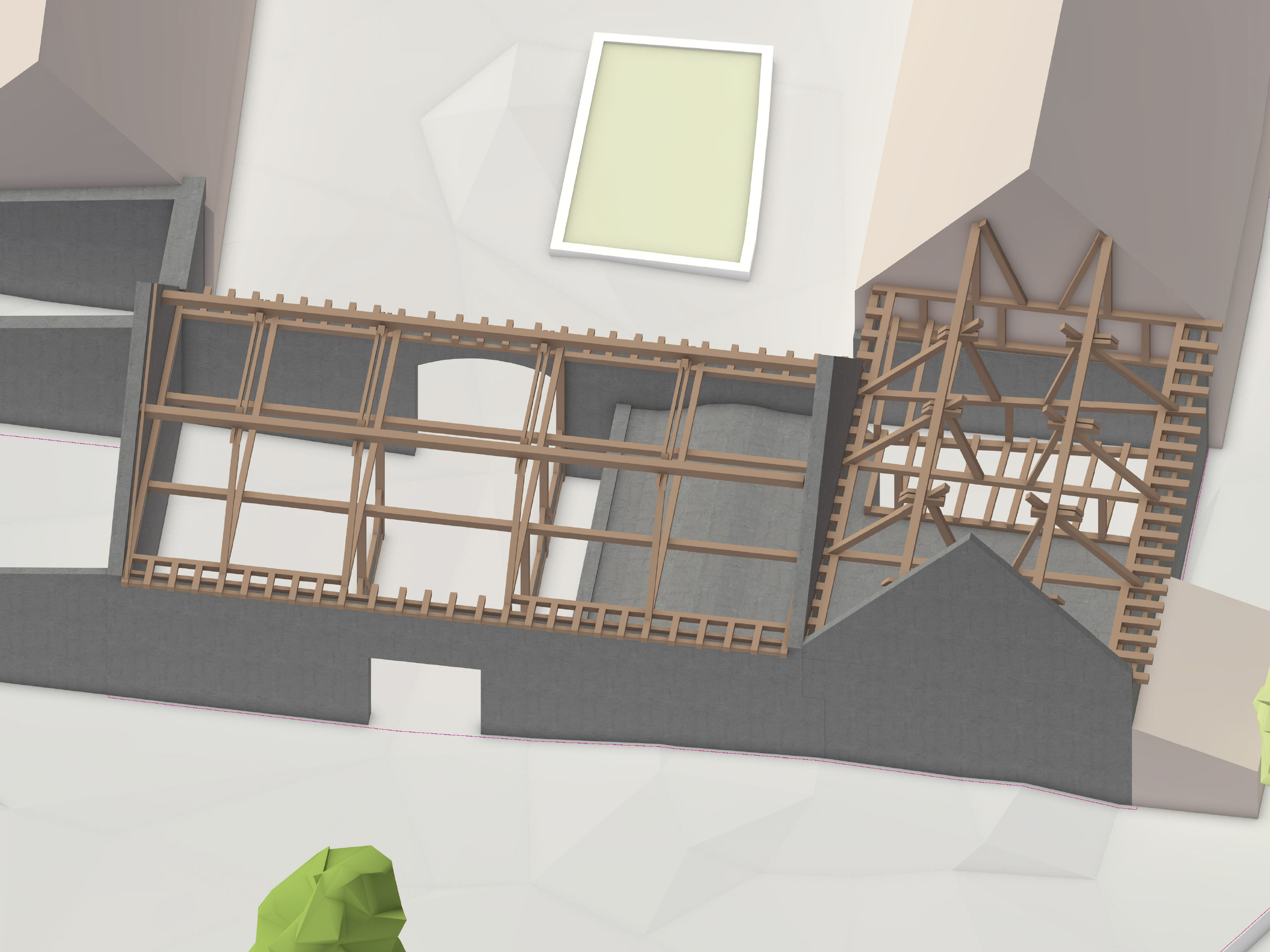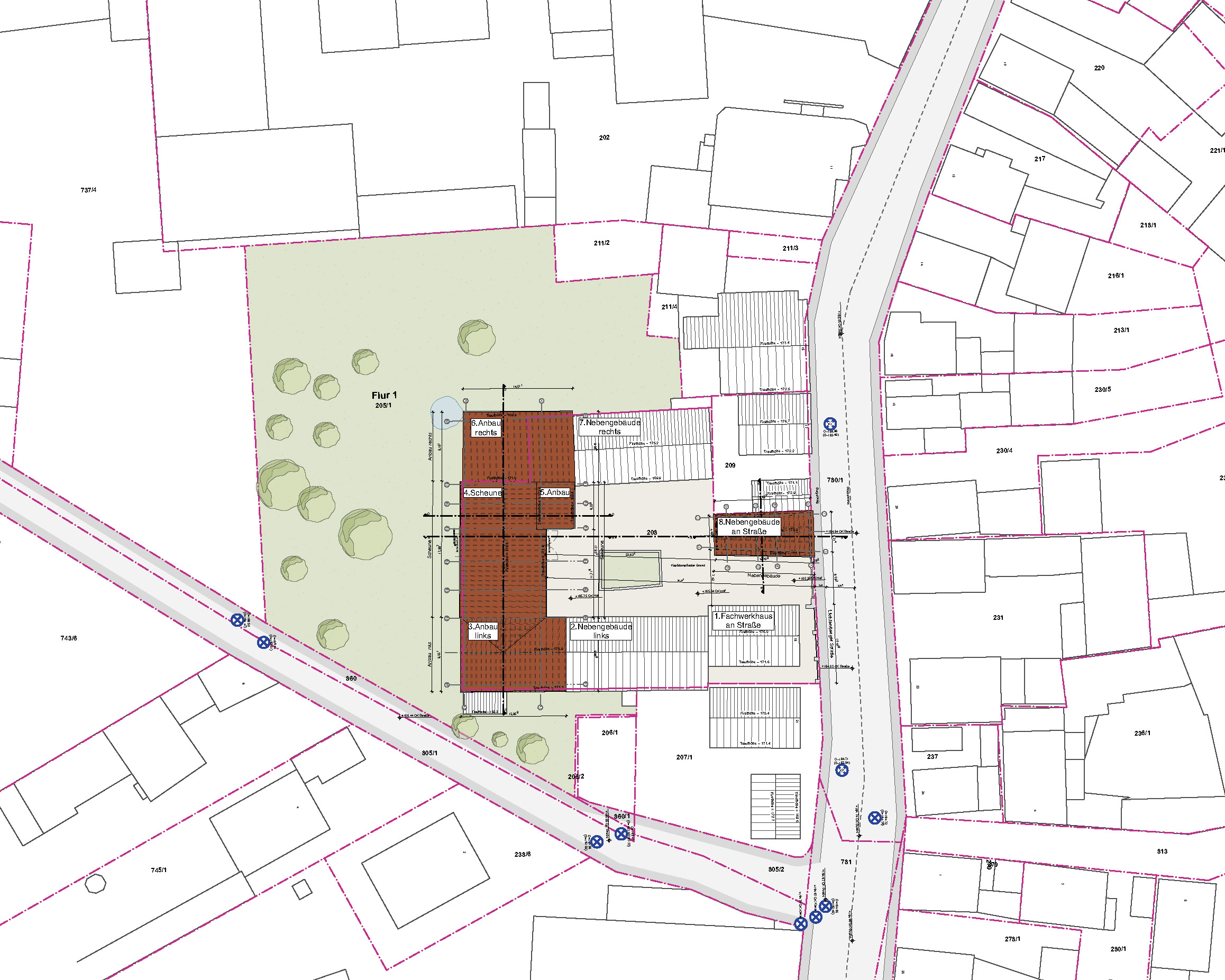 Die Scheune soll zu einem Wohnhaus mit einer Nutzungseinheit umgebaut werden. Sie teilt sich in folgende 3 Bereiche im Erdgeschoss, in die Scheunendurchfahrt, das Gewölbe auf der linken Seite und den rechten Bereich. Die Scheunendurchfahrt soll zukünftig als temporär geheizte Wohnhalle genutzt werden. Vor dem Gewölbe befinden sich verschiedene Nebenfunktionen wie eine Garderobe, ein WC und die Erschließung nach oben. Das Gewölbe selbst wird als Wein-/Partykeller genutzt. Von hieraus erreicht man ein weiteres Gewölbe, welches ein Kellerersatzraum ist. Die rechte Scheunenseite wird als Wohnraum genutzt. Hier befinden sich die Küche, das Esszimmer und Wohnzimmer. Von der Wohnhalle erreicht man den Innenhof der Hofreite und auch die Terrasse mit Garten im Westen der Anlage. Im Obergeschoss wird die Dreiteilung der Nutzungen fortgeführt. In der Mitte befindet sich wieder die offene Wohnhalle von der aus man alle weiteren Räume erschließt. Der Bereich für die Kinder mit Bad und zwei Schlafzimmern befindet sich über dem Gewölbe auf der linken Seite. Auf der rechten Seite befindet sich der Bereich der Eltern, mit Badezimmer, Ankleide, Schlafzimmer und kleinem Balkon.