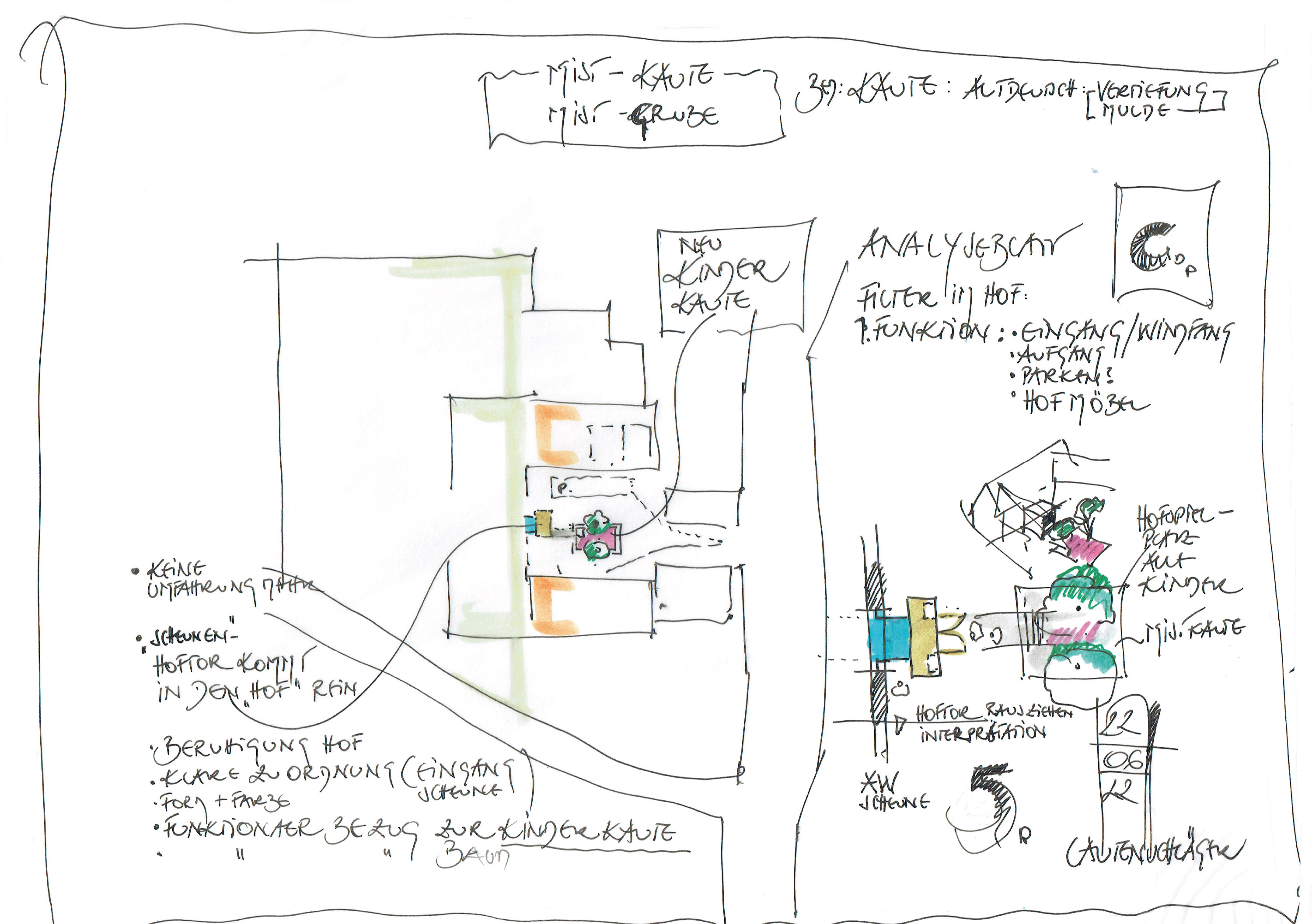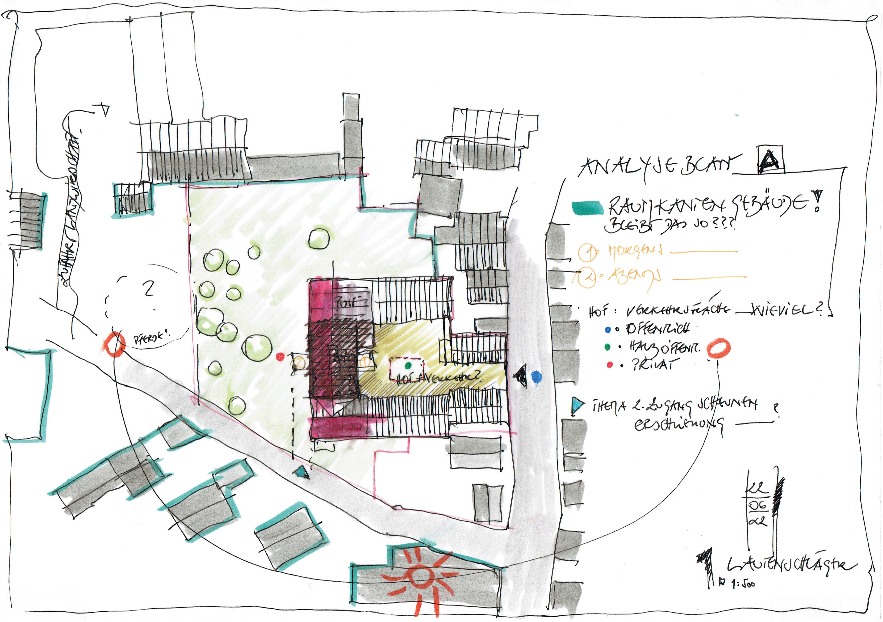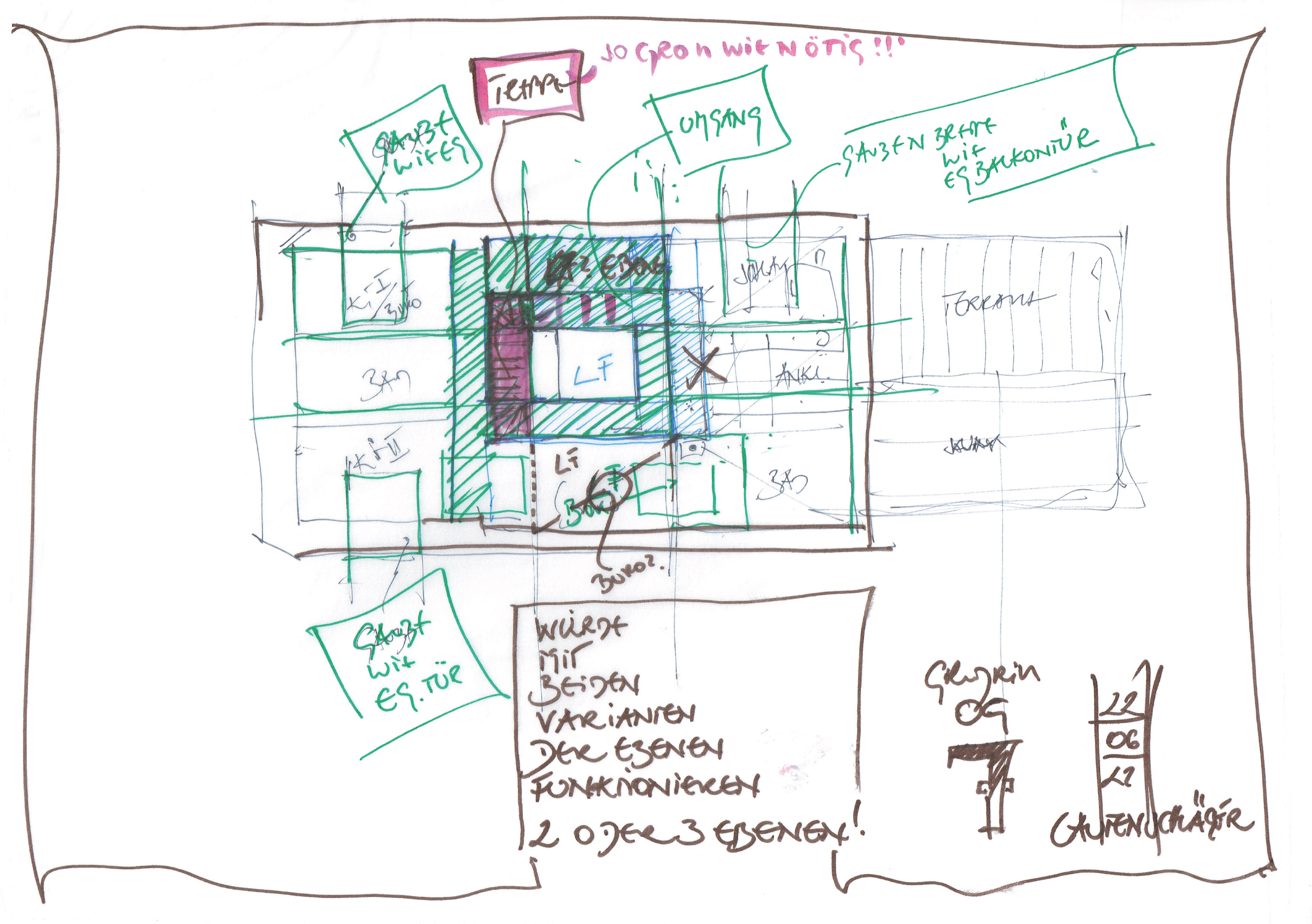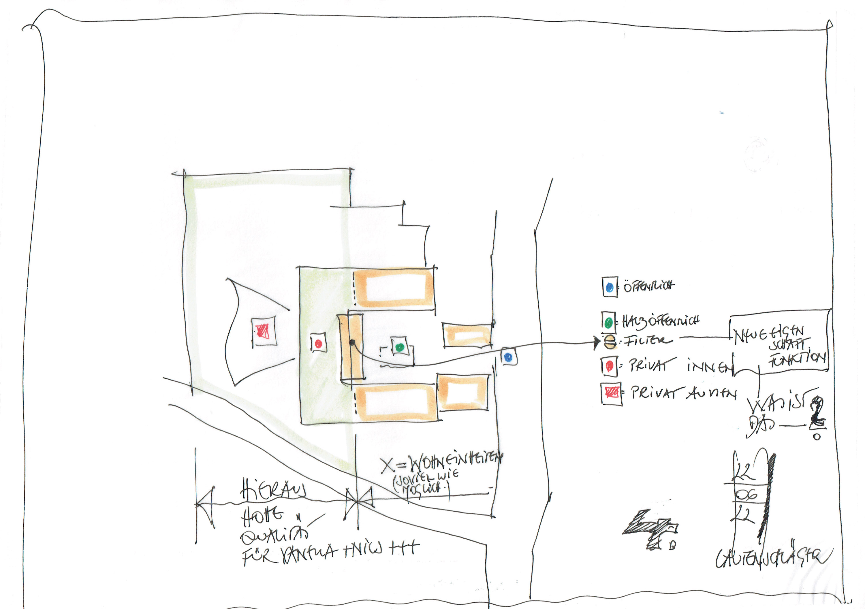 Die Scheune soll zu einem Wohnhaus mit einer Nutzungseinheit umgebaut werden. Sie teilt sich in folgende 3 Bereiche im Erdgeschoss, in die Scheunendurchfahrt, das Gewölbe auf der linken Seite und den rechten Bereich. Die Scheunendurchfahrt soll zukünftig als temporär geheizte Wohnhalle genutzt werden. Vor dem Gewölbe befinden sich verschiedene Nebenfunktionen wie eine Garderobe, ein WC und die Erschließung nach oben. Das Gewölbe selbst wird als Wein-/Partykeller genutzt. Von hieraus erreicht man ein weiteres Gewölbe, welches ein Kellerersatzraum ist. Die rechte Scheunenseite wird als Wohnraum genutzt. Hier befinden sich die Küche, das Esszimmer und Wohnzimmer. Von der Wohnhalle erreicht man den Innenhof der Hofreite und auch die Terrasse mit Garten im Westen der Anlage. Im Obergeschoss wird die Dreiteilung der Nutzungen fortgeführt. In der Mitte befindet sich wieder die offene Wohnhalle von der aus man alle weiteren Räume erschließt. Der Bereich für die Kinder mit Bad und zwei Schlafzimmern befindet sich über dem Gewölbe auf der linken Seite. Auf der rechten Seite befindet sich der Bereich der Eltern, mit Badezimmer, Ankleide, Schlafzimmer und kleinem Balkon.