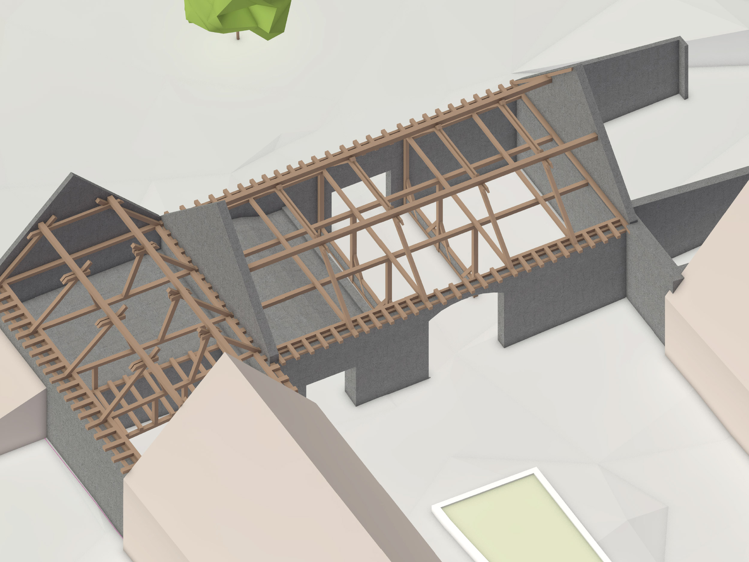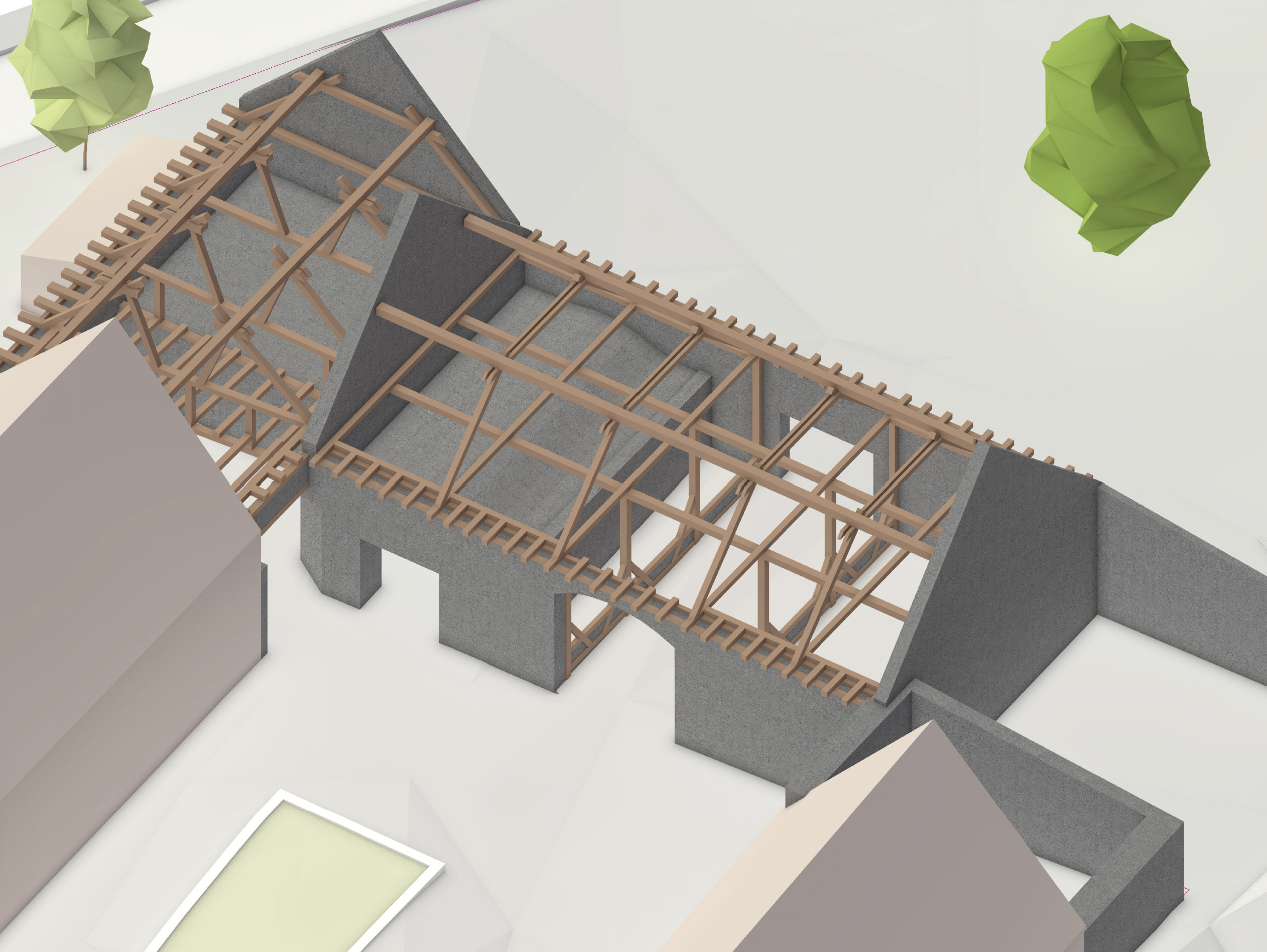 Die Scheune ist komplett in Bruchstein gemauert. Innenseitig wird eine Wärmedämmung zur Optimierung der historischen Struktur angebracht. Die Decke über EG wird als Holzbalkendecke auf die bestehende Binderzugbalken Konstruktion aufgebracht. Die Decke über OG im Bereich der Kinderzimmer wird ebenfalls neu aufgebaut. Das Dach ist ein Pfettendach, mit fünf Binderachsen (stehender Stuhl). Die geplante Dacheindeckung ist als roter Tonziegel ausgeführt. Die bestehende Tragkonstruktion, Mauerwerk, wie Dachkonstruktion wird erhalten.
